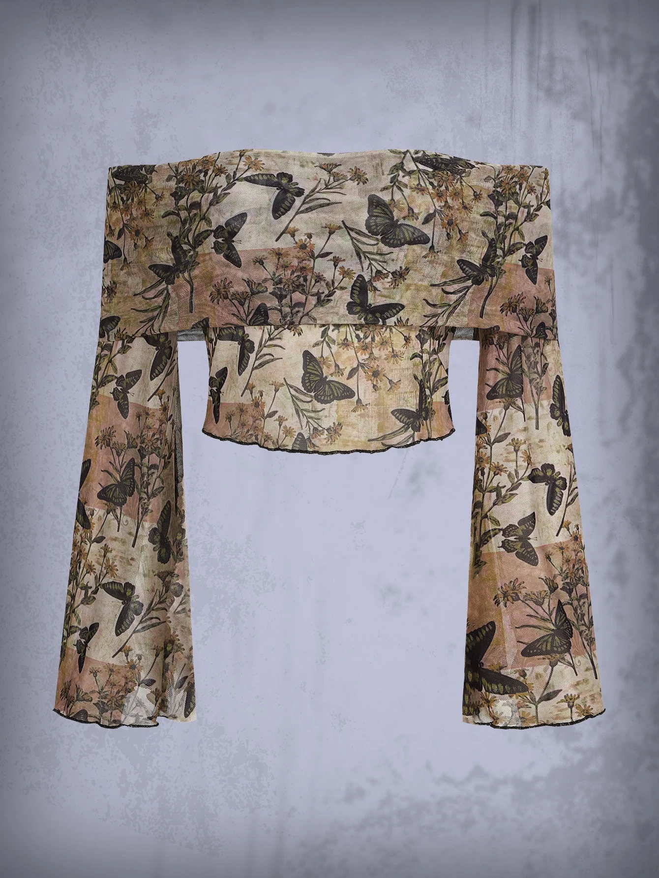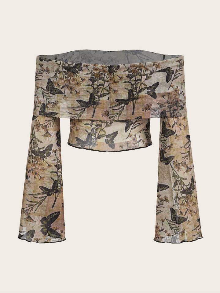 Butterfly Print Off Shoulder Trumpet Sleeve Mesh Top