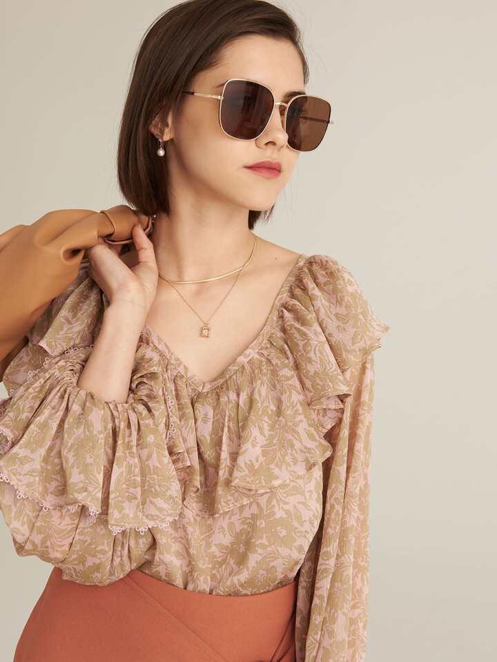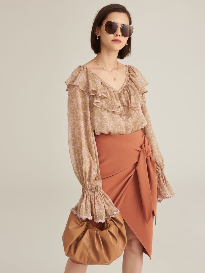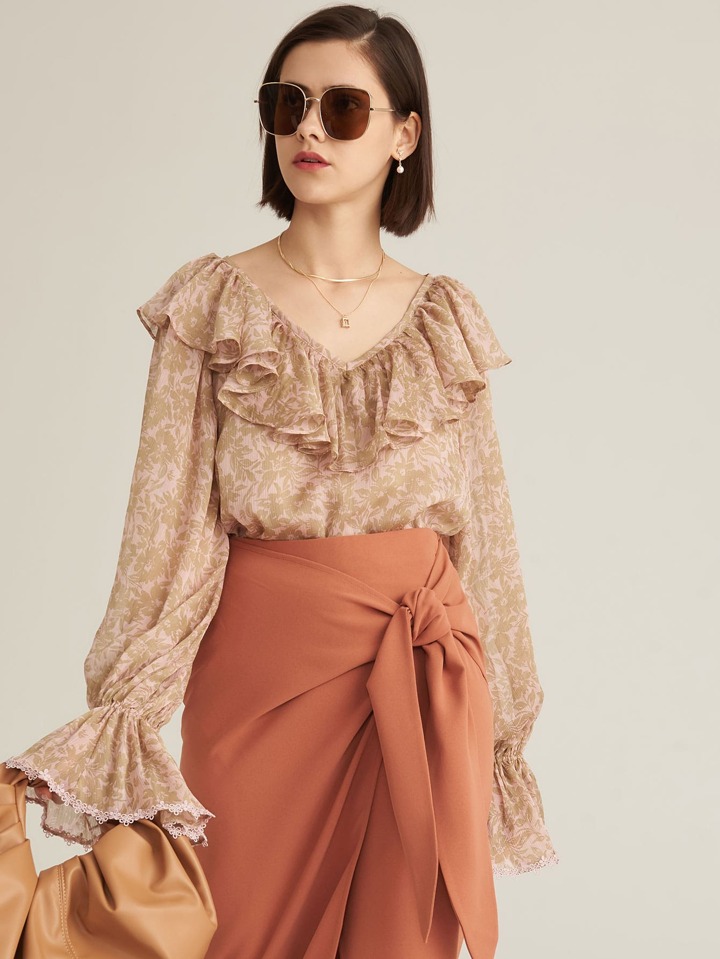 CHIFFON RUFFLE TRIM JACQUARD TOP