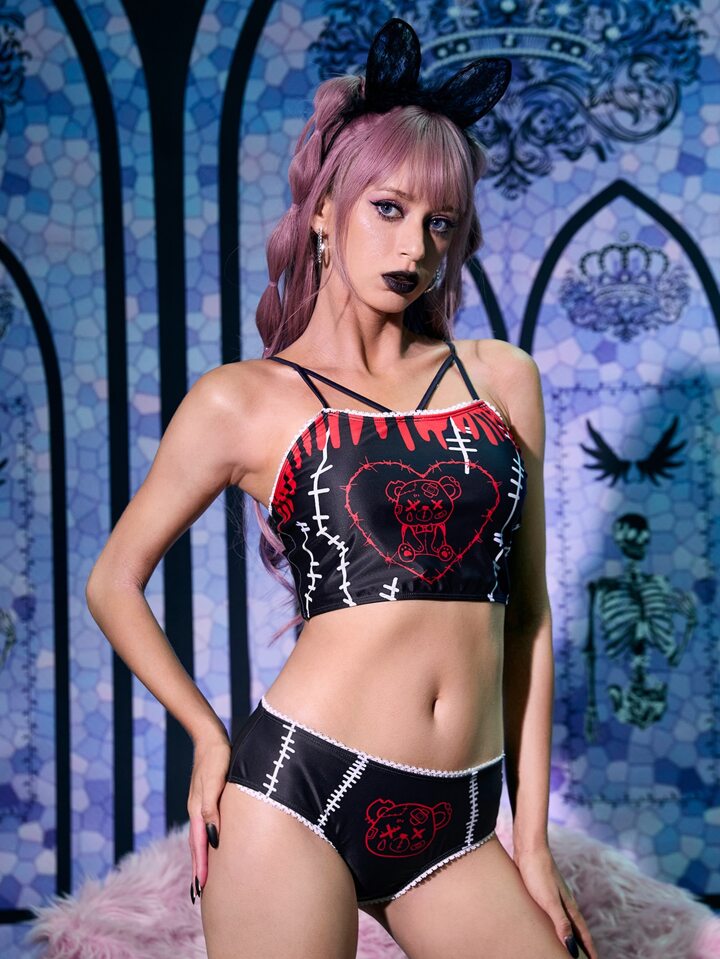 Cartoon Bear Graphic Cut Out Summer Beach Bikini Set