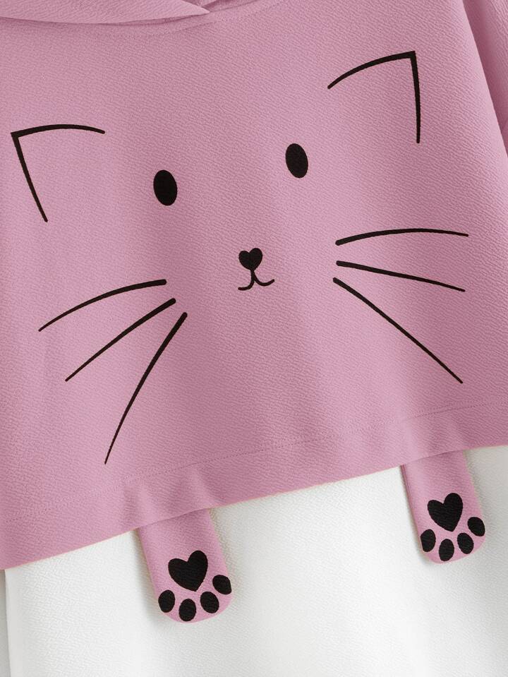 Cat Print Kangaroo Pocket Two Tone Hooded Sweatshirt