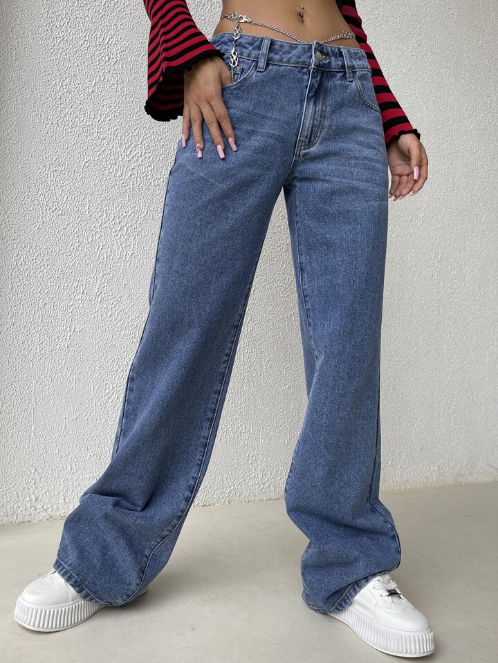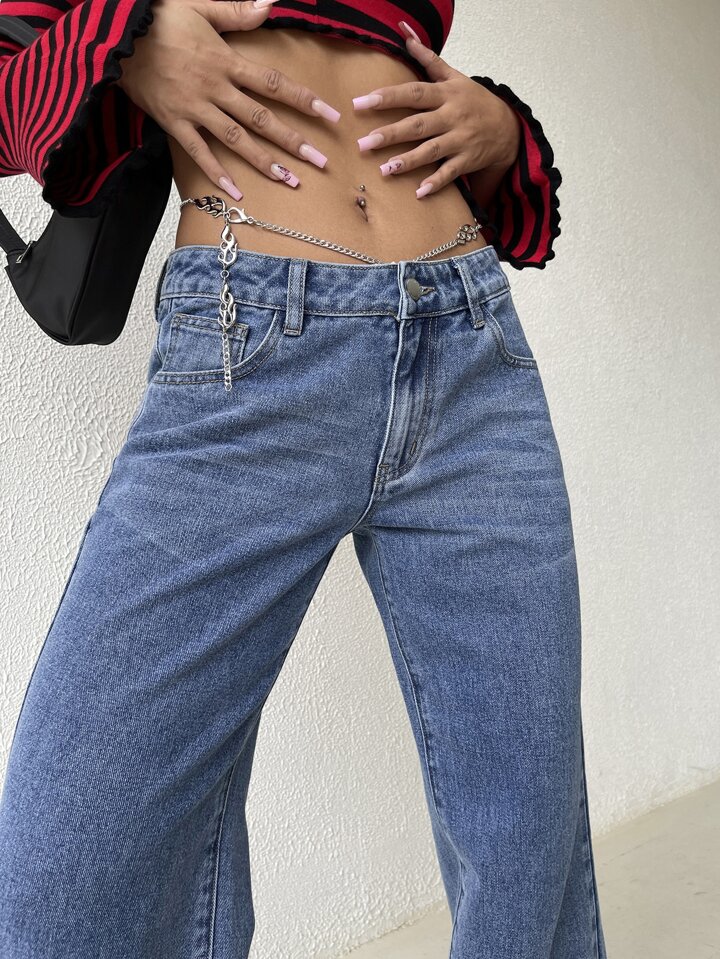 Chain Detail Wide Leg Jeans, Fall Women Clothes