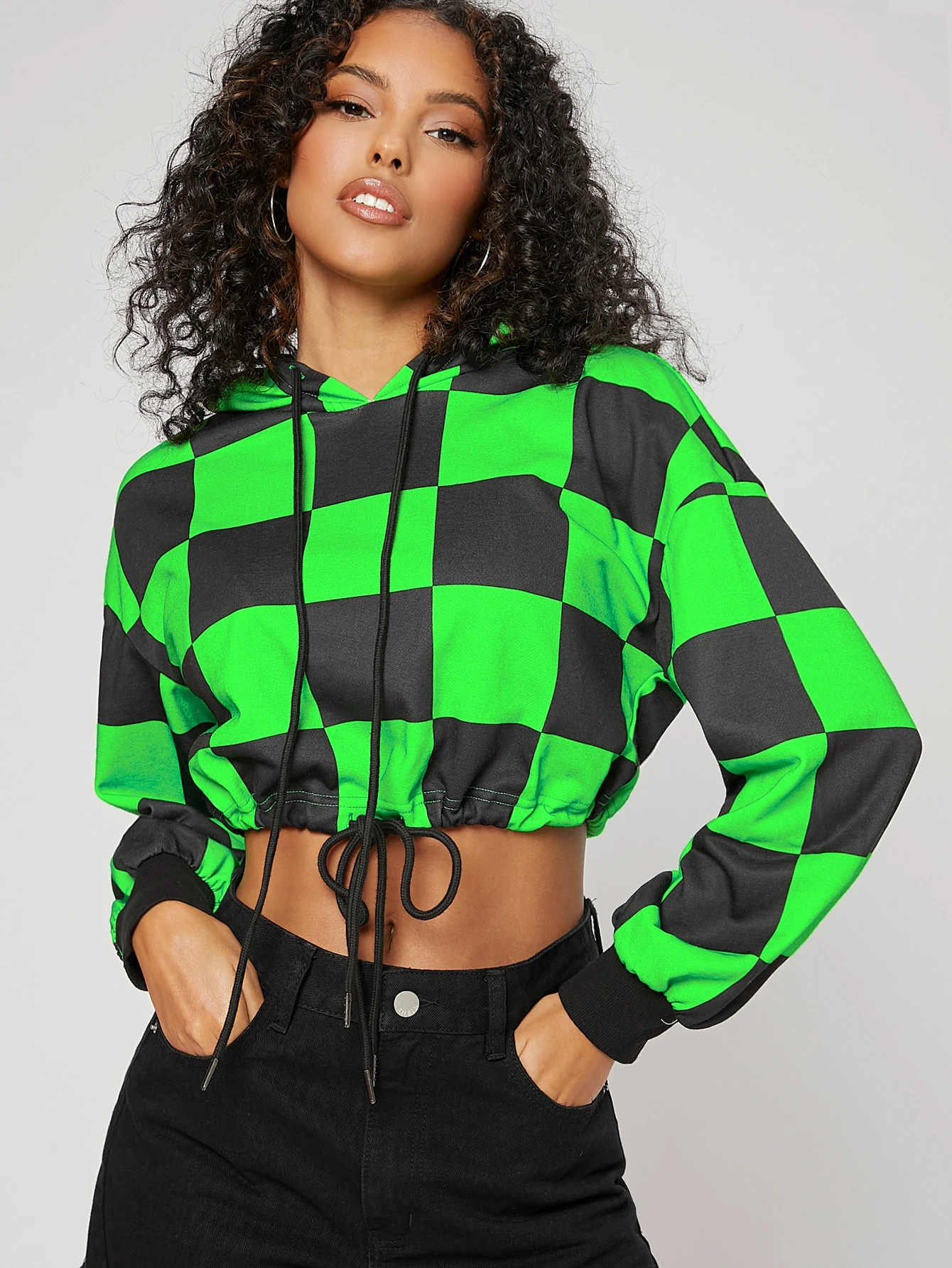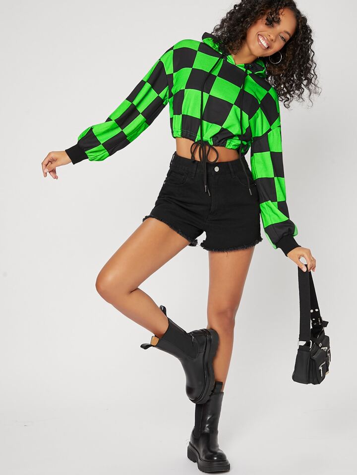 Checked Drawstring Crop Hoodie