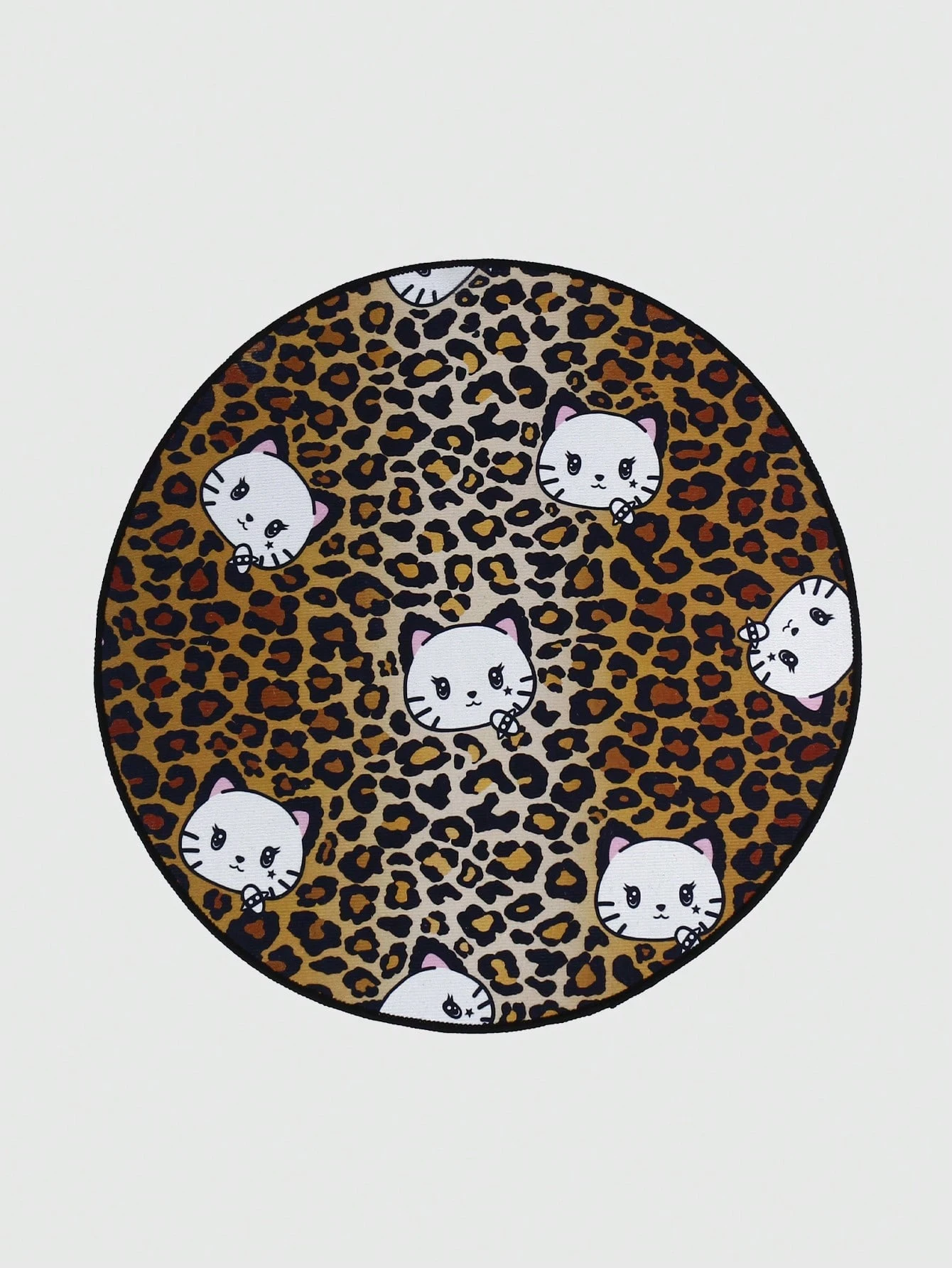 Grunge Punk Chic Leopard Print Cat Round Rug With Black Edging, Suitable For Bedroom, Living Room, Bathroom, Dining Room, Halloween