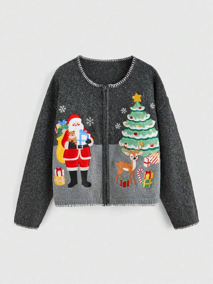 Christmas Holiday Santa Claus, Reindeer, Christmas Tree, Snowflake Embroidery Corduroy Crew Neck Women Cardigan Sweater