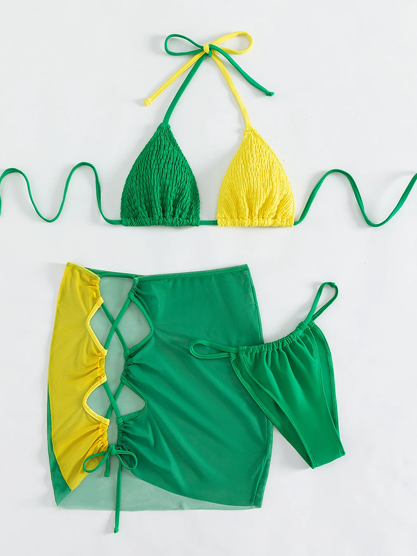 Colorblock Halter Triangle Summer Beach Bikini Set With Beach Skirt
