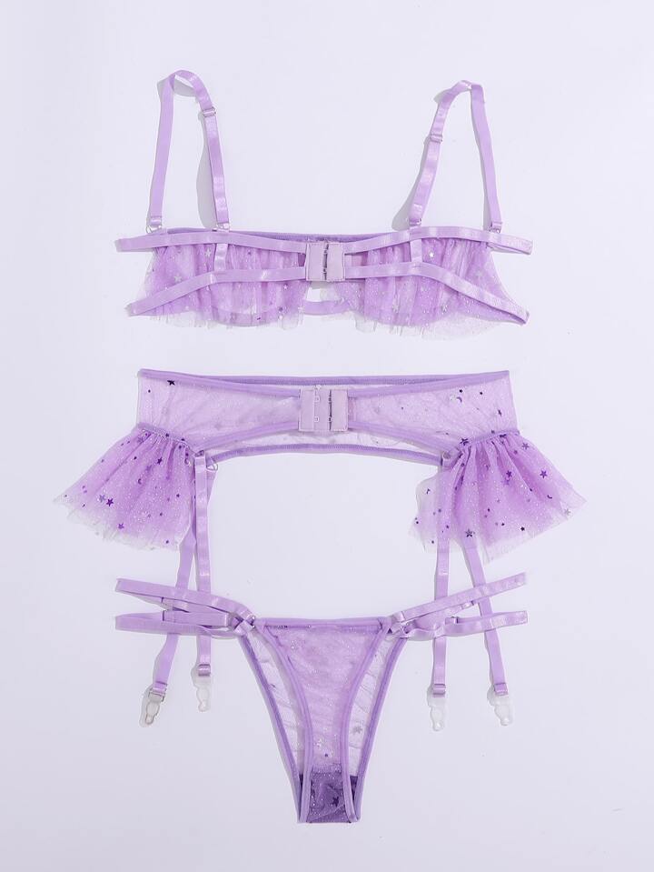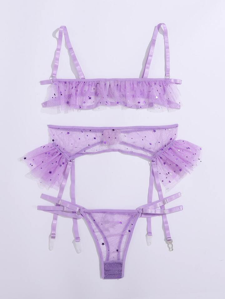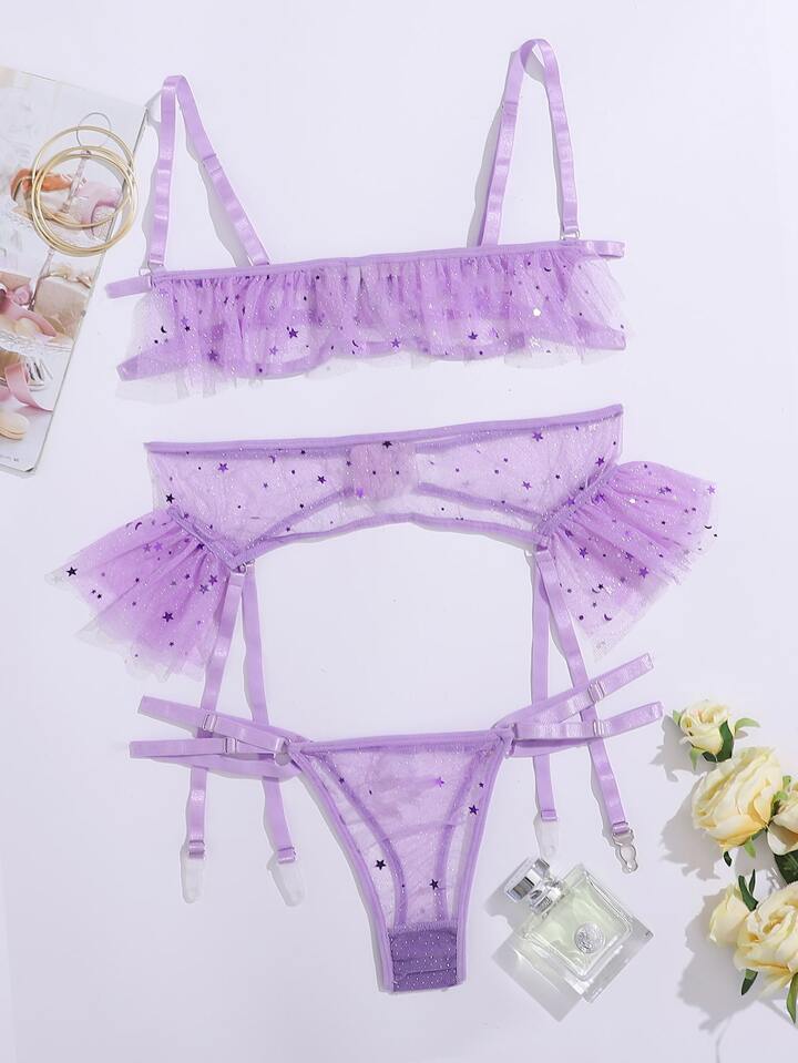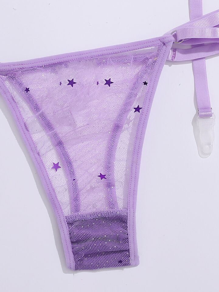 Contrast Sequin Mesh Garter Lingerie Set