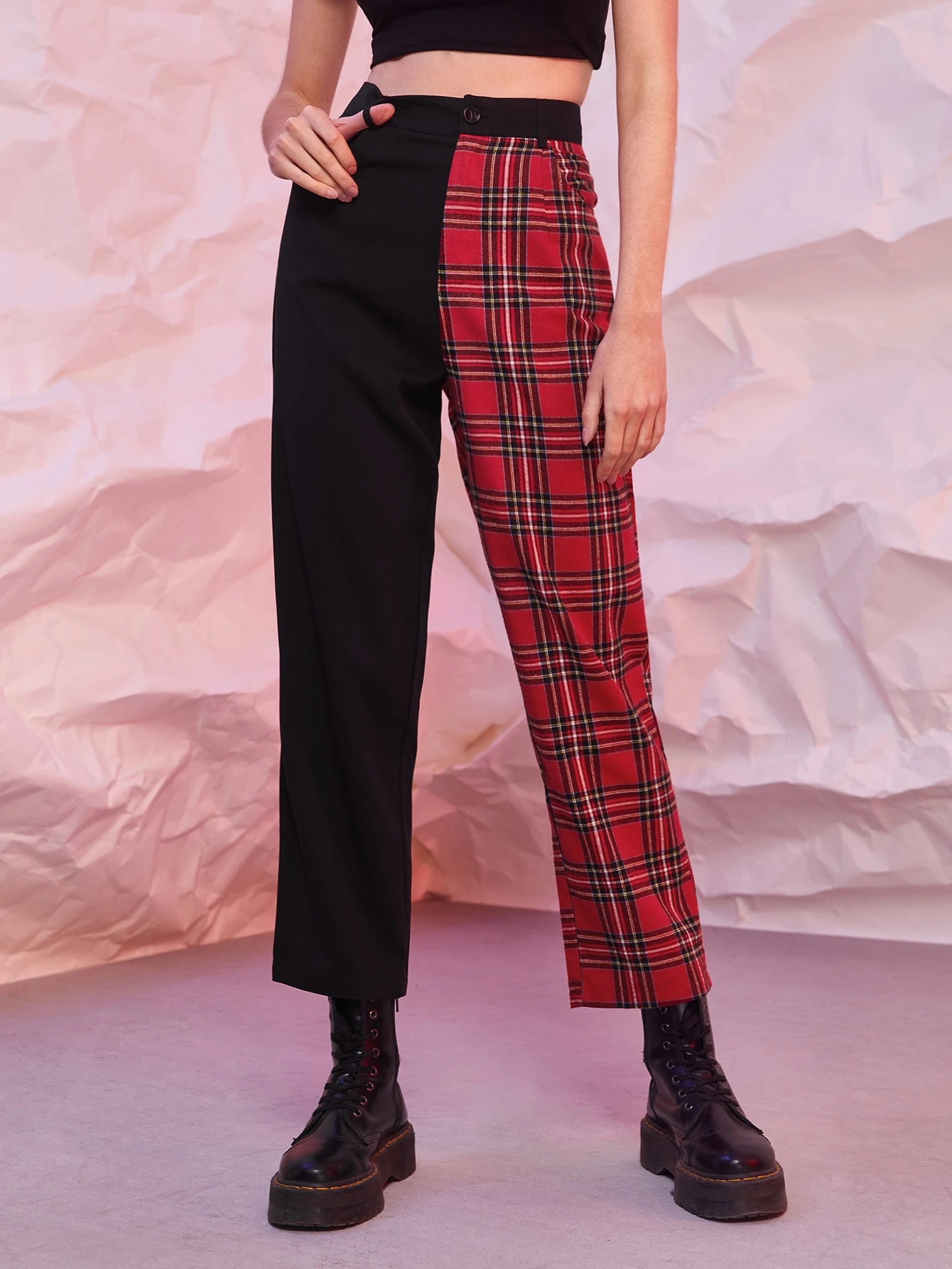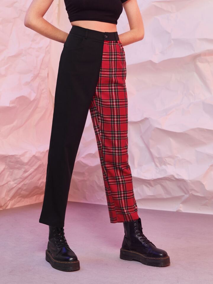 Contrast Tartan Print Straight Leg Pants