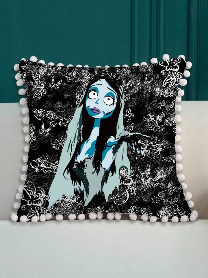 Corpse Bride | ROMWE 1pc Figure Graphic Pom Pom Decor Cushion Cover Without Filler,Dark Washable Decorative Square Pillowcase