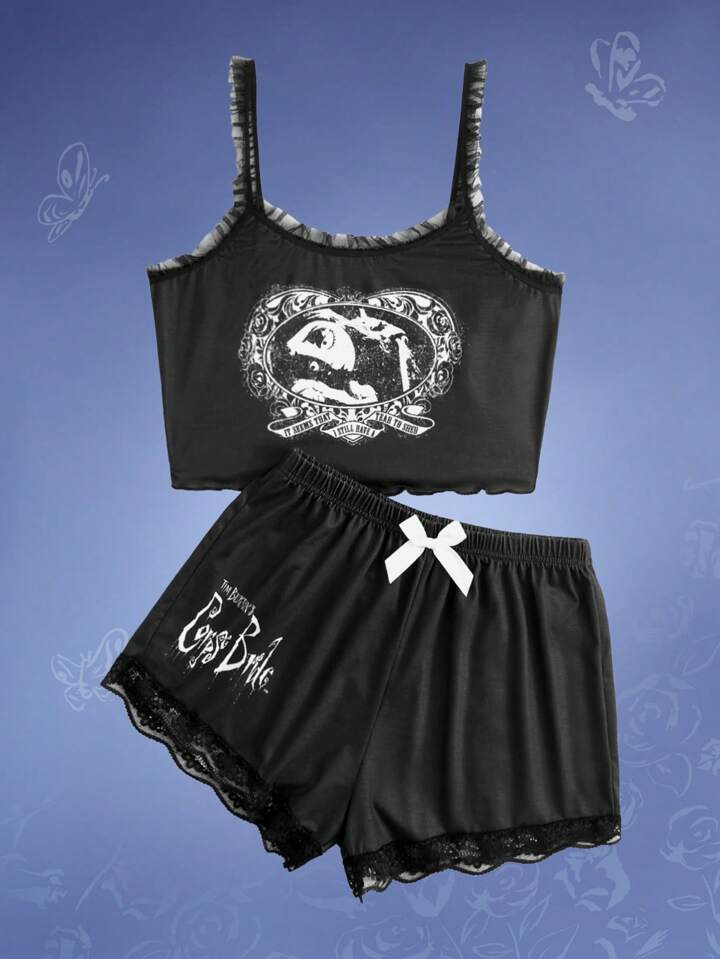 Corpse Bride | ROMWE Letter Graphic Contrast Lace PJ Set