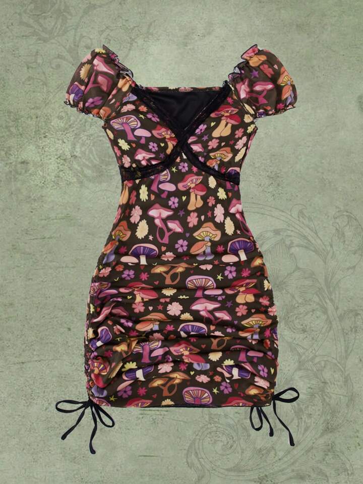 CourtneyGrabenShop Allover Print Contrast Lace Drawstring Ruched Dress