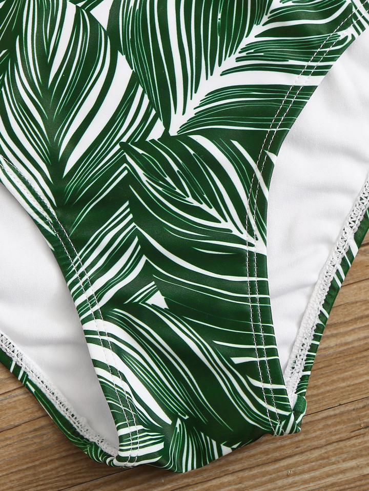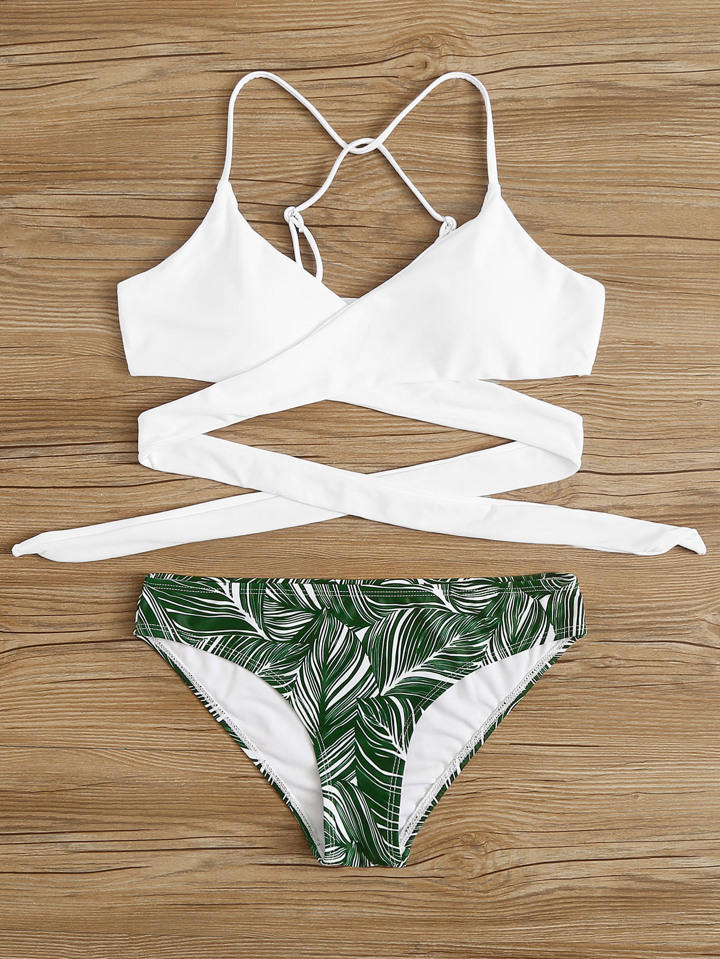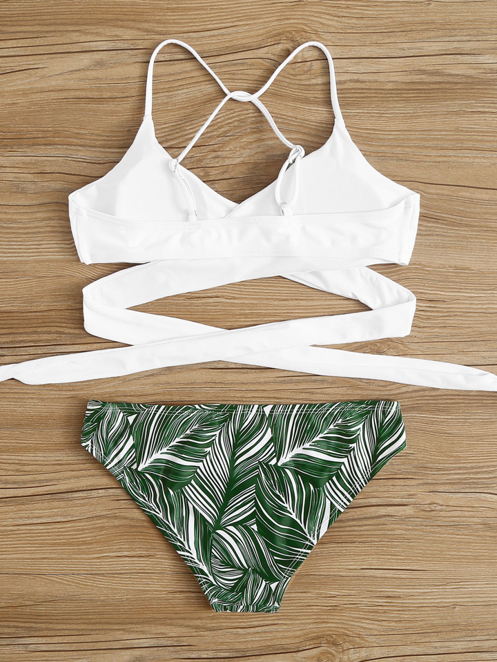 Criss Cross Wrap Top With Random Leaf Print Bikini