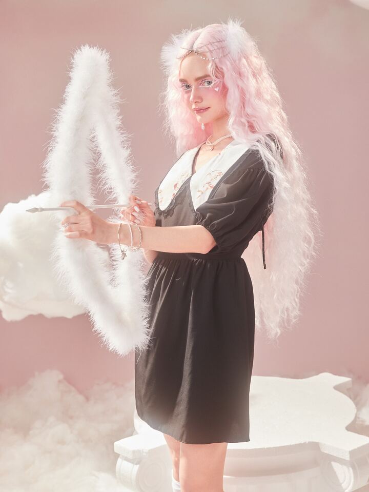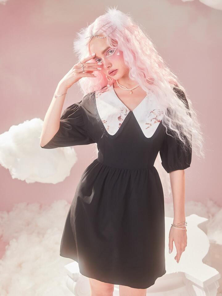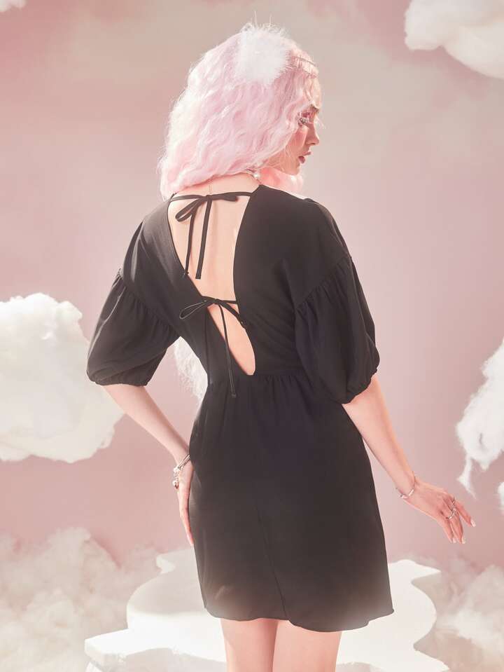 Cupid Print Contrast Collar Tie Backless Puff Sleeve Dress