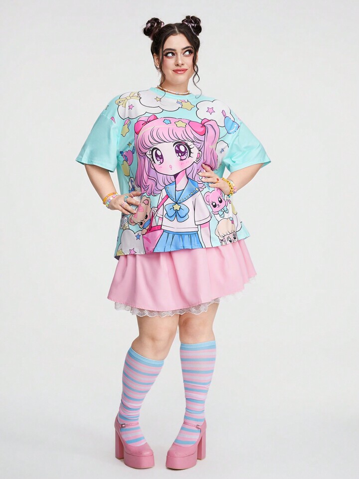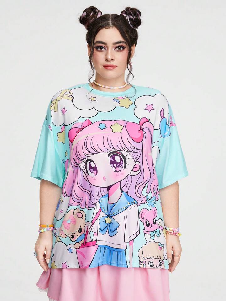 Cute Anime Girl Multicolor Casual College Style Plus Size T-Shirt