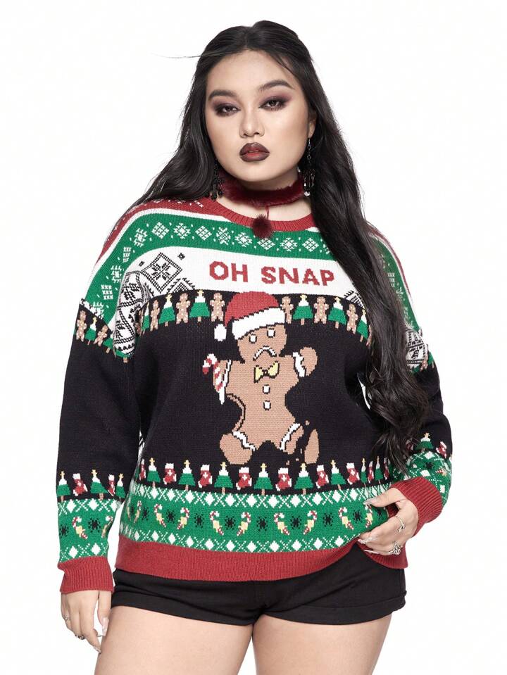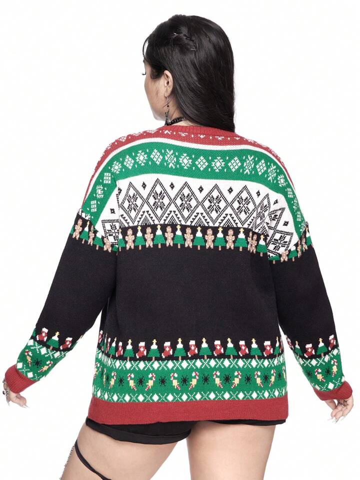 Cute Christmas Retro Gingerbread Man & Snowflake Intarsia Knit Loose Fit Plus Size Pullover Sweater, For Winter