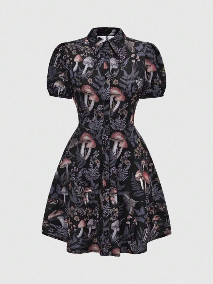 Dark Gothic Floral & Mushroom Print Waist Defined Shirt Dress For Women, Summer Outfit