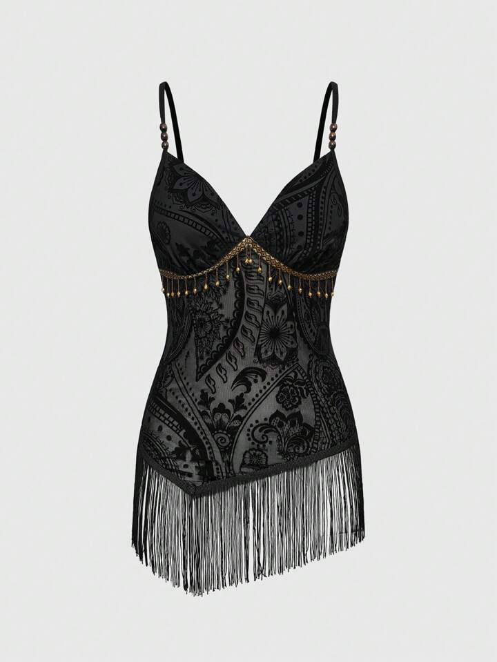 EDITION Dark Gothic Retro Boho Flocked Patchwork Tasseled Camisole