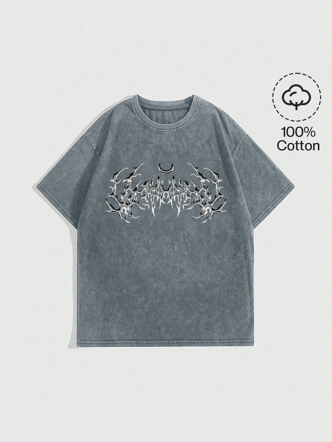 Grunge Punk Dark Spider Skeleton Slogan Plus Size Graphic Print Washed Loose T-Shirt, Greyish Blue, Plus Size