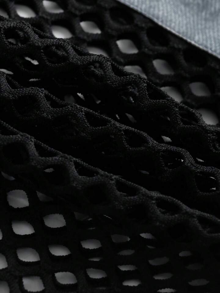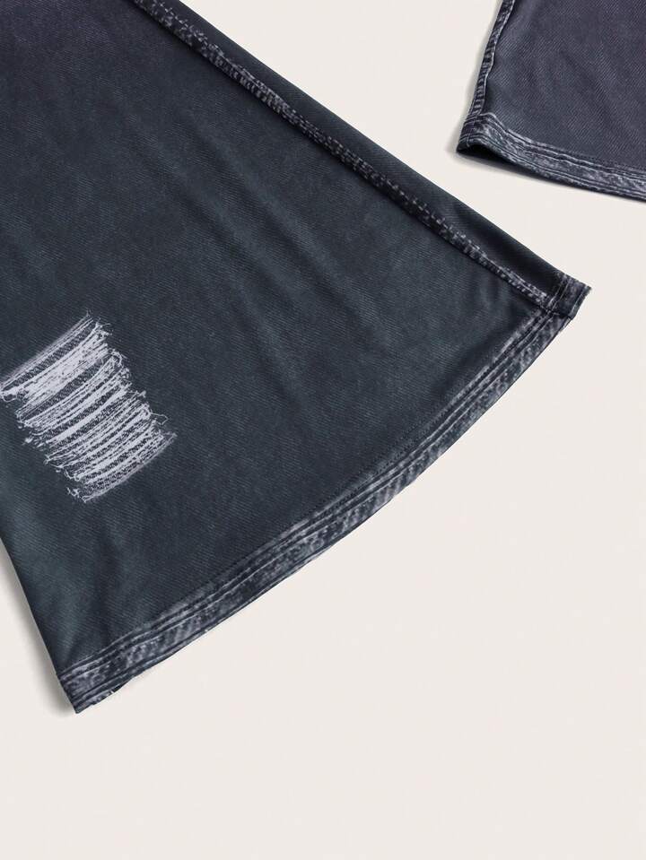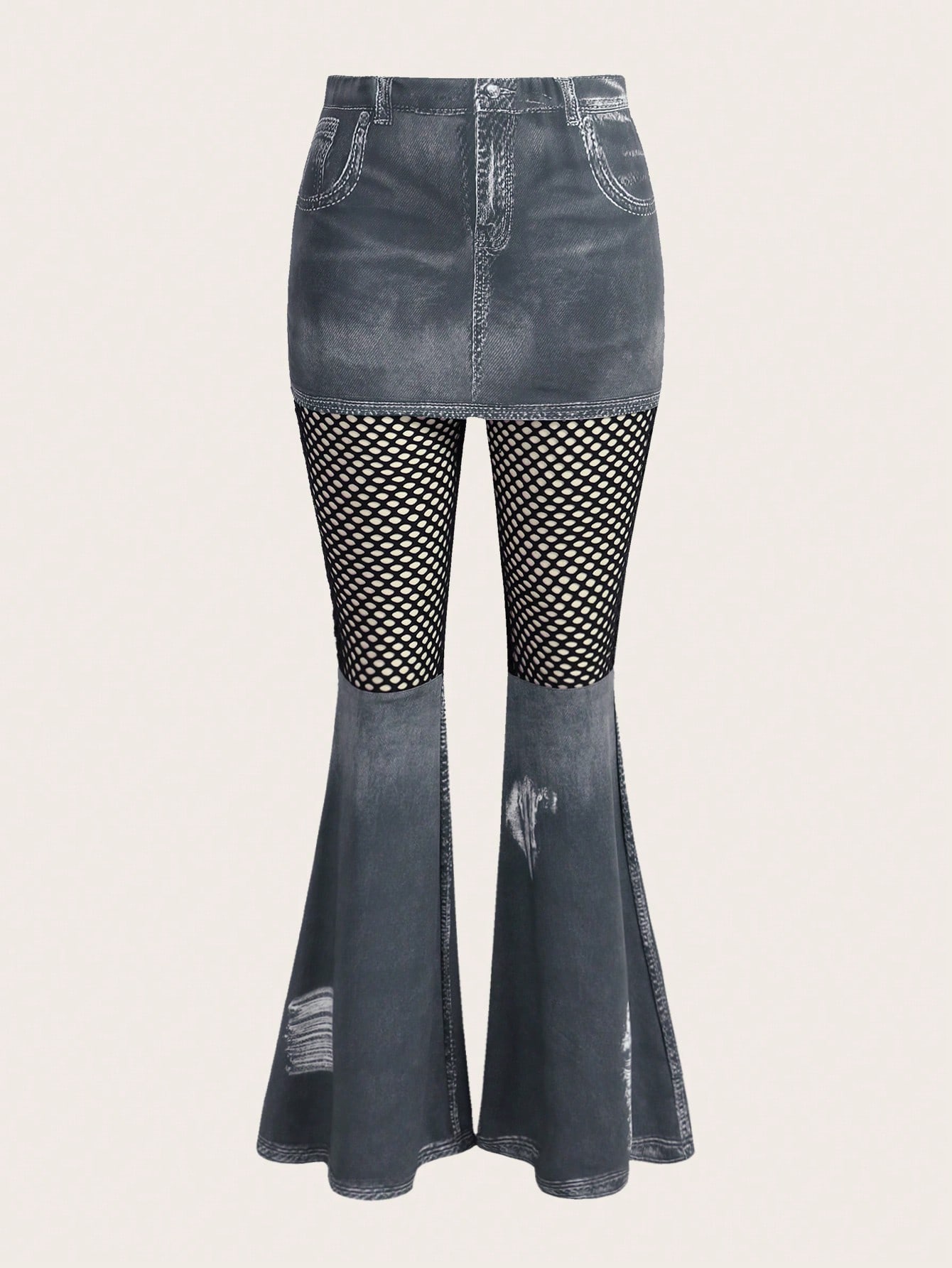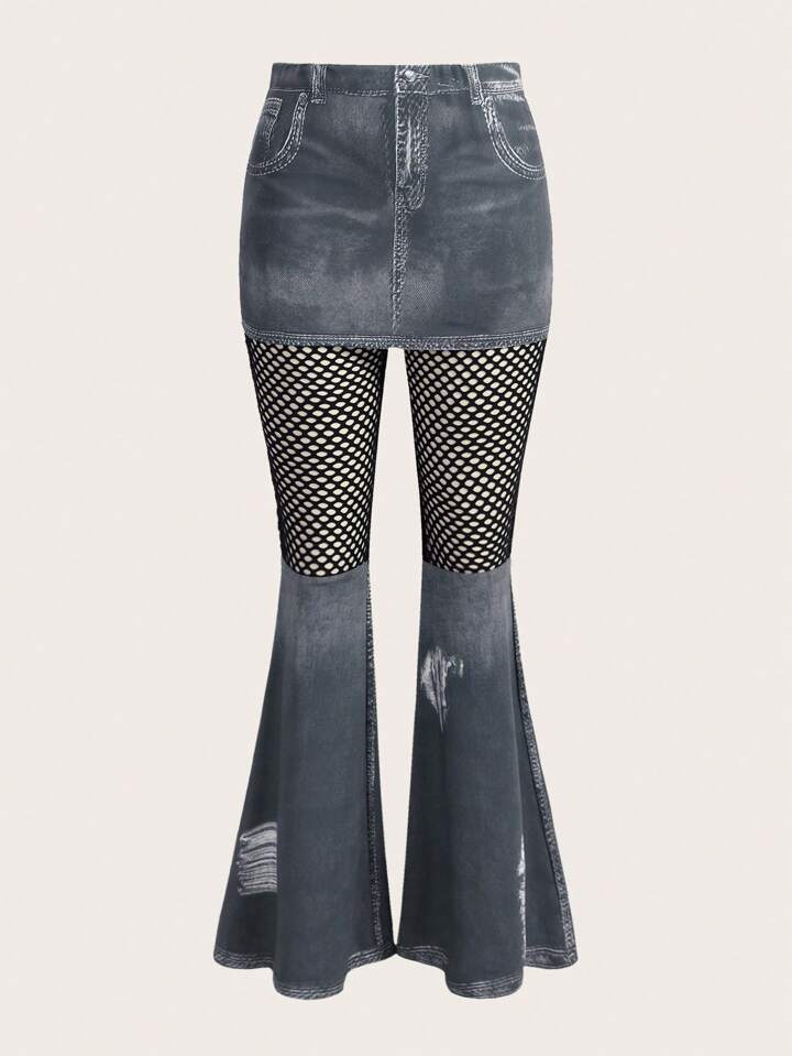 Denim-Effect Print Ripped Frayed Contrast Fishnet Flare Leg Pants Without Belt