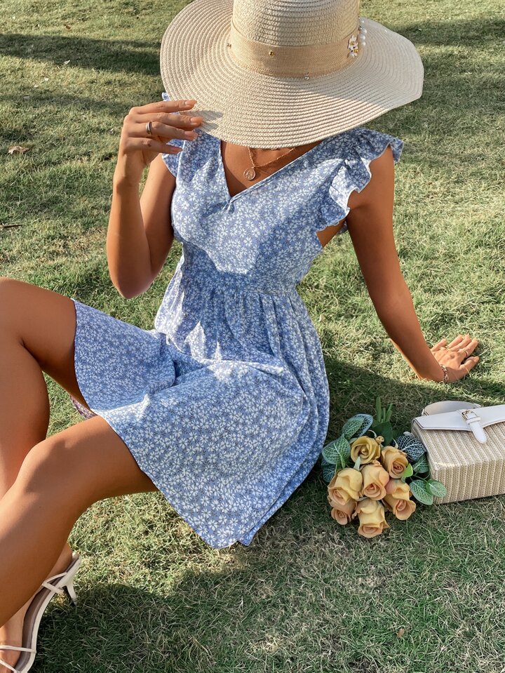 Ditsy Floral Backless Knot Ruffle Trim Dress