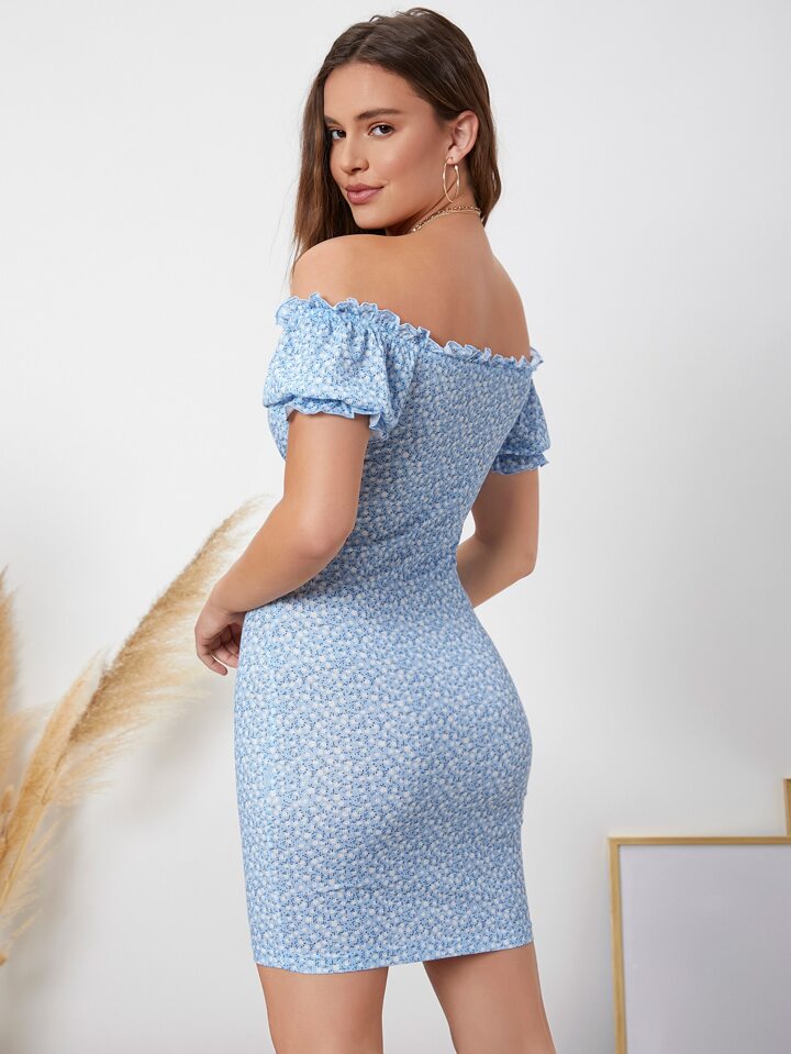 Ditsy Floral Off Shoulder Puff Sleeve Tie Front Bodycon Dress
