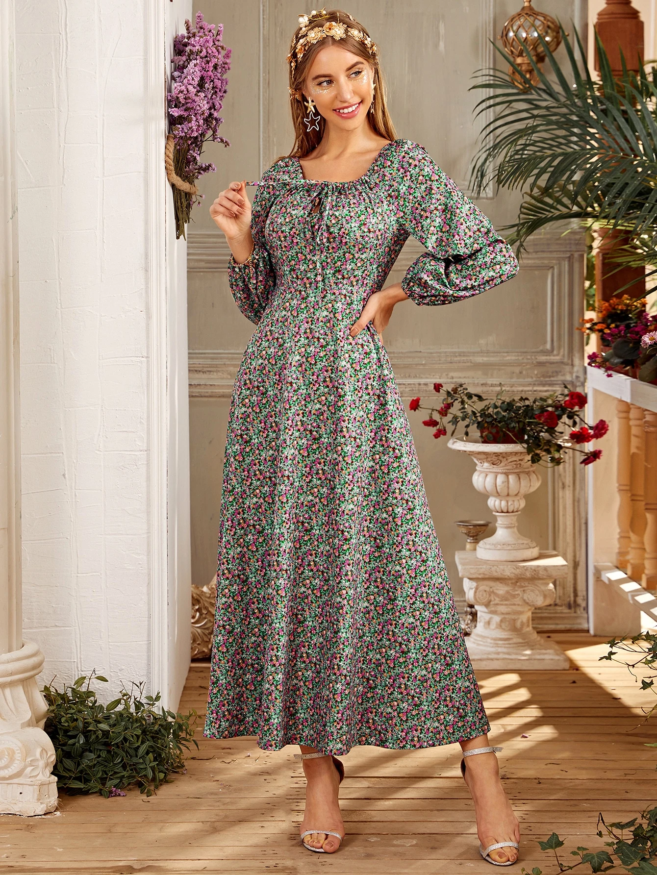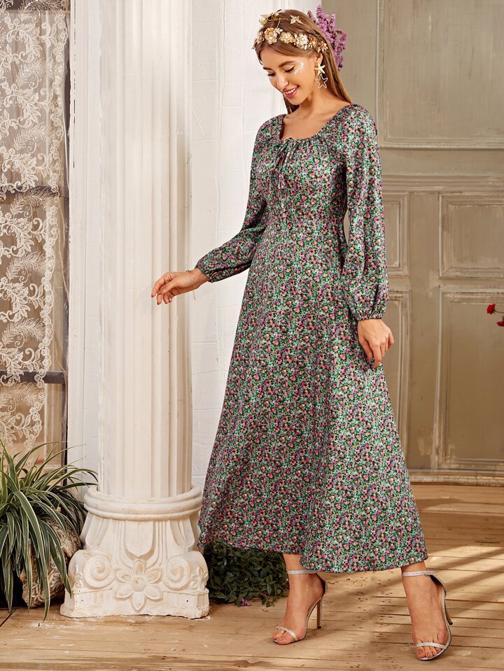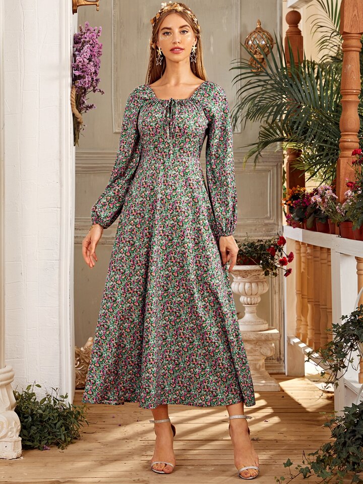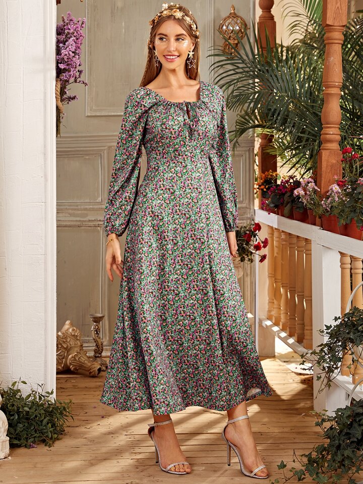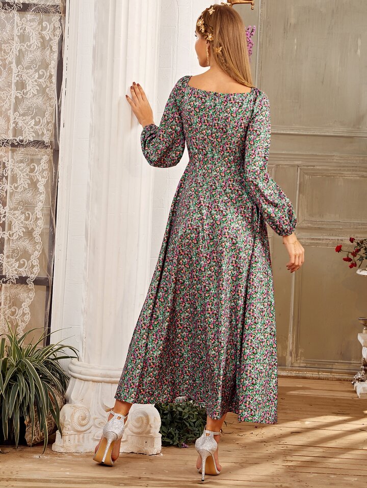 Ditsy Floral Square Neck Bishop Sleeve A-line Dress