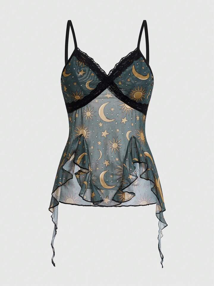 DoodlebyMeg Sun And Moon Print Lace Mesh Splicing Camisole Top