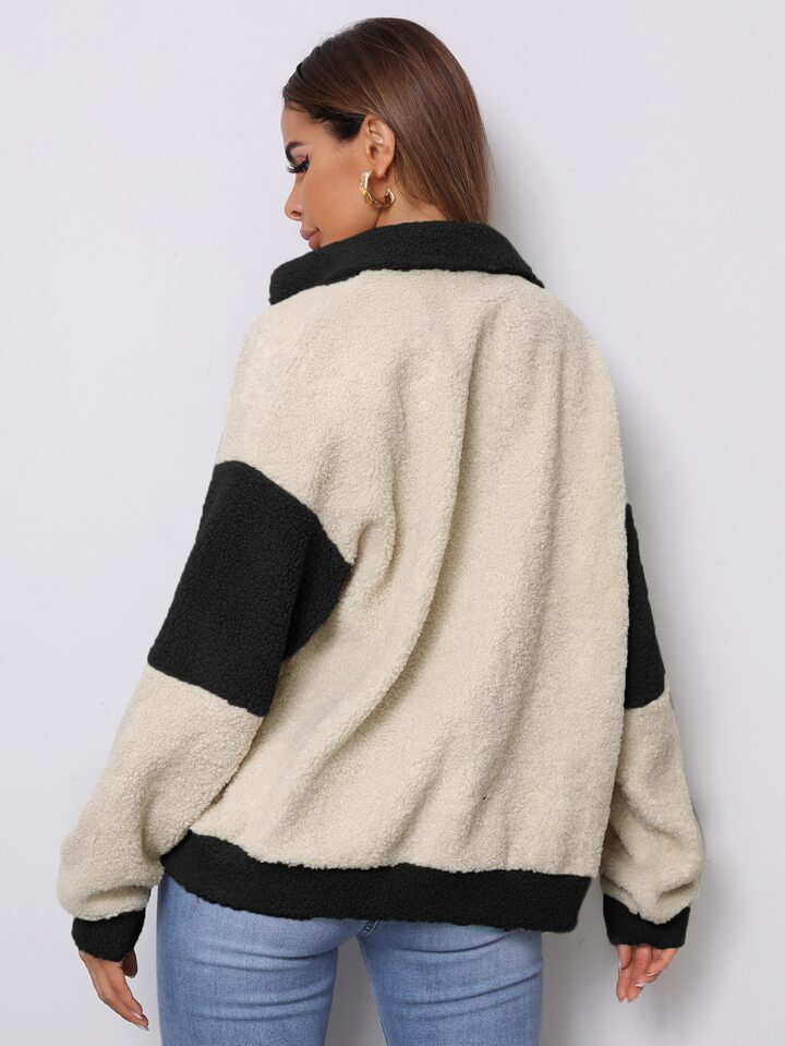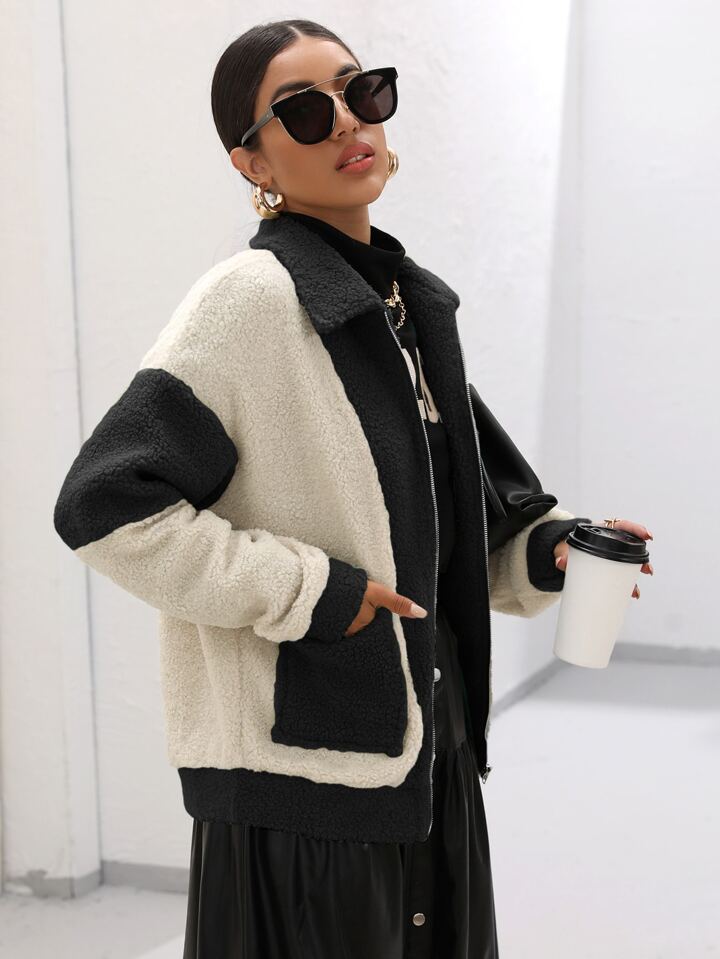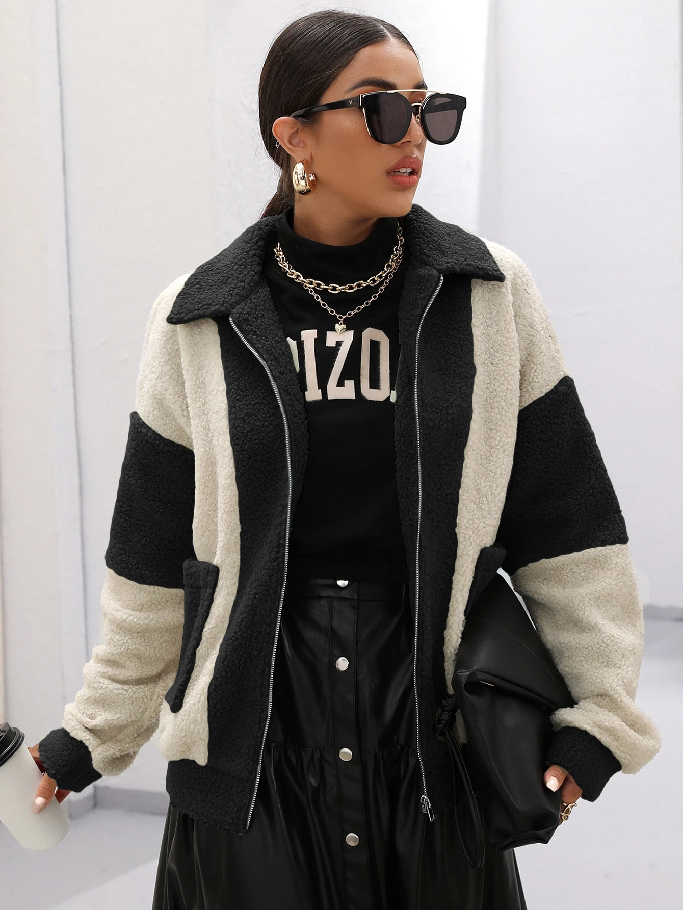 Drop Shoulder Patch Pocket Colorblock Teddy Jacket