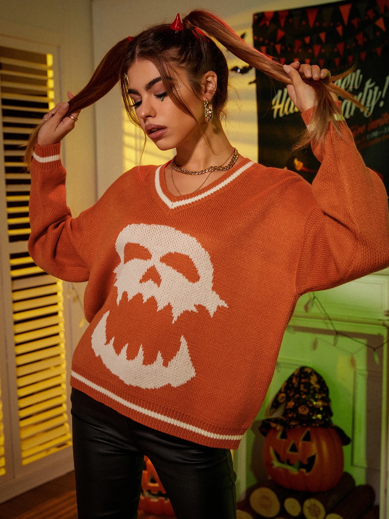 Drop Shoulder Skull Pattern Sweater