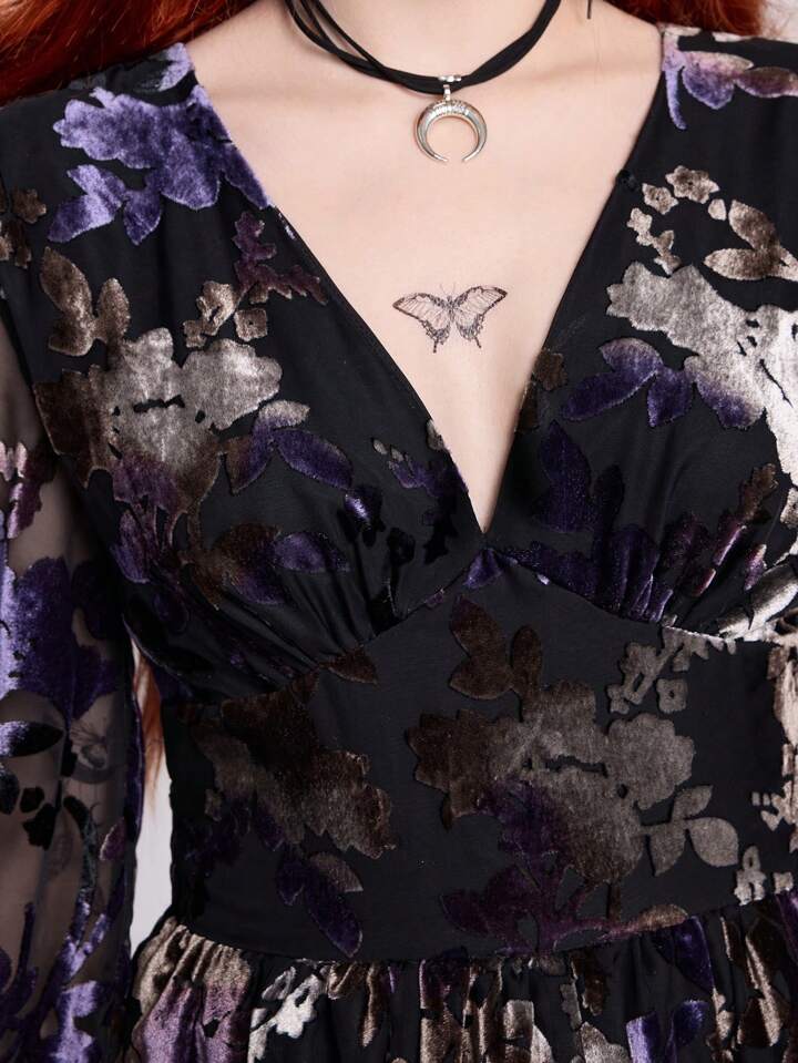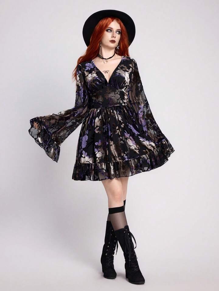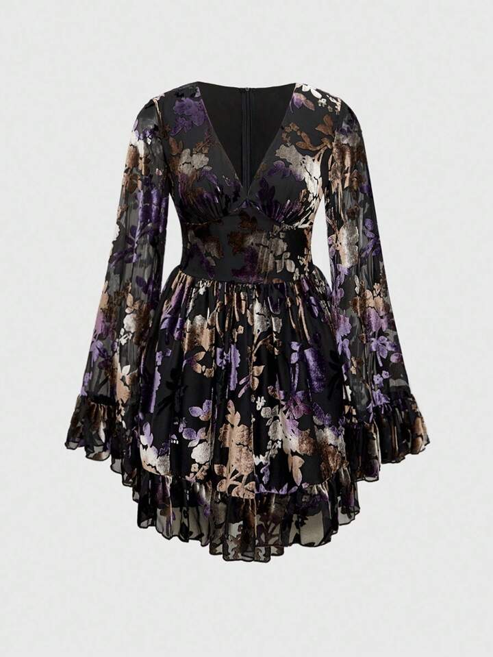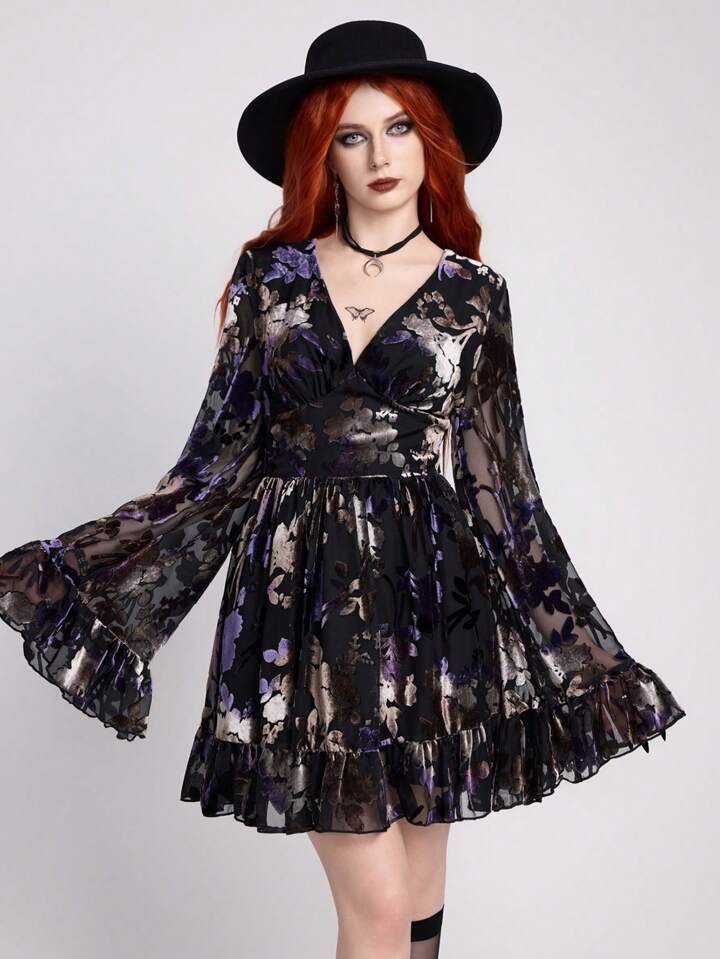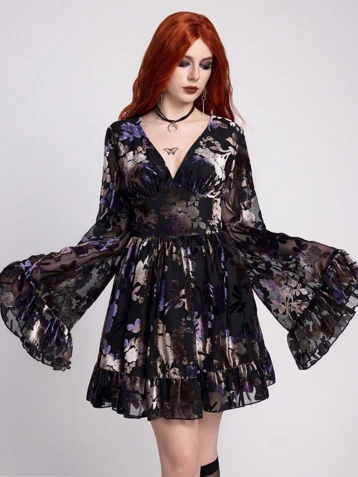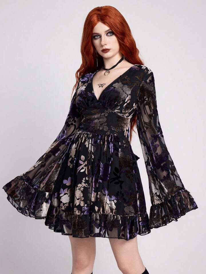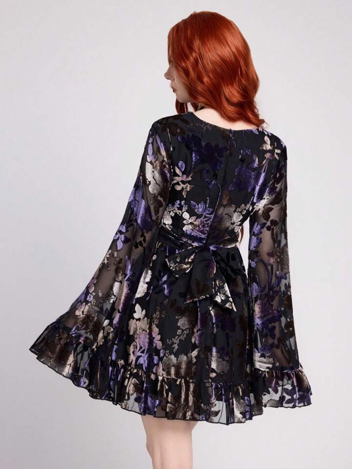 EDITION Dark Sexy Bohemian Style Velvet Jacquard Deep V-Neck Bell Sleeve Midi Dress