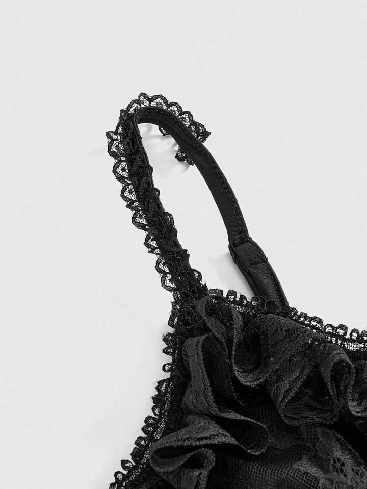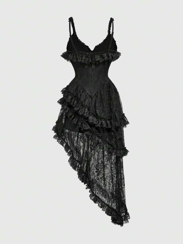 EDITION Gothic Asymmetrical Asymmetric Hem Multi-Layer Lace Splicing V-Neck Belted Women's Mid-Calf Dress