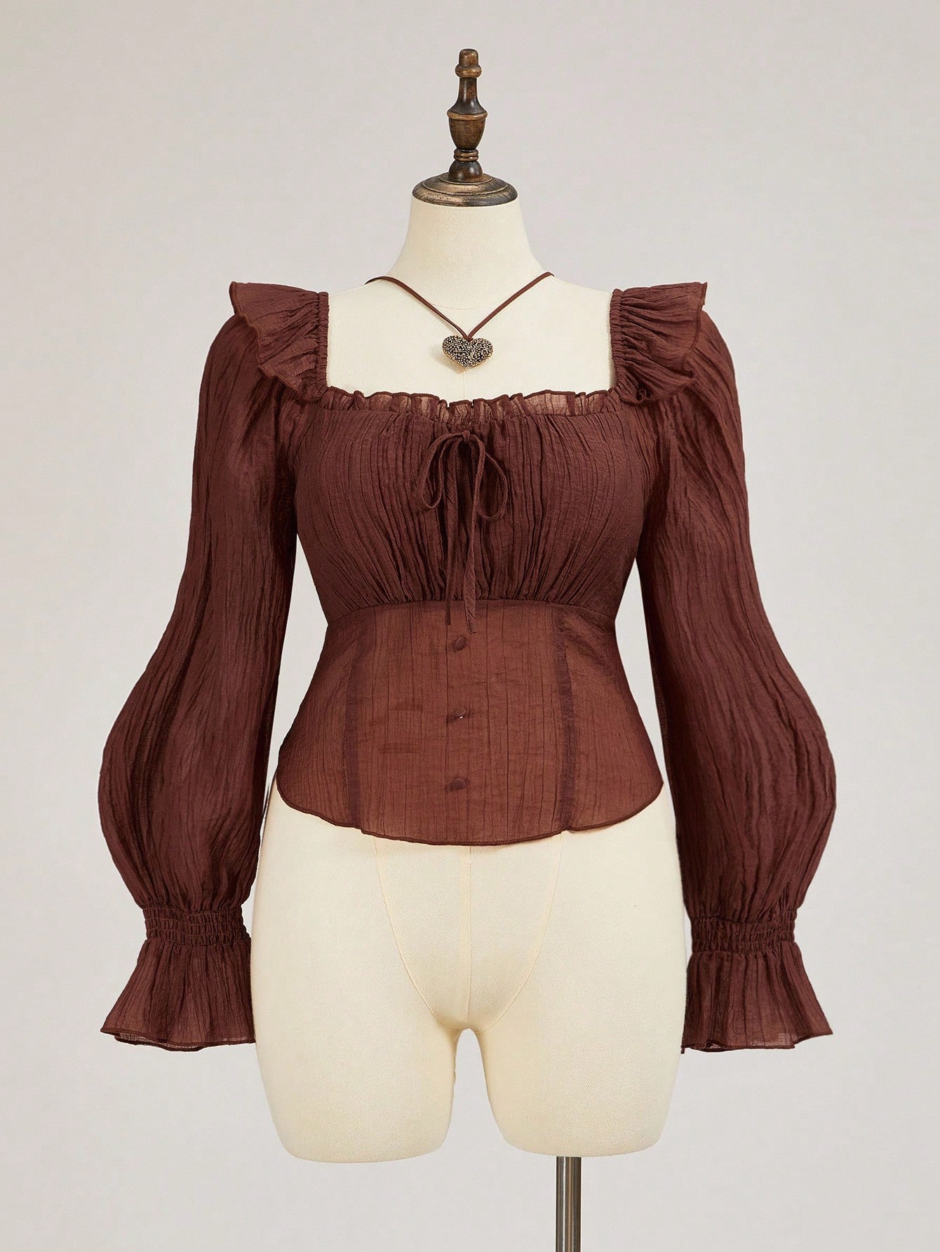 EDITION Plus Size Medieval Vintage Mori Style Square Collar Ruffle Hem Puff Sleeve Blouse, Suitable For Outerwear Or Layering