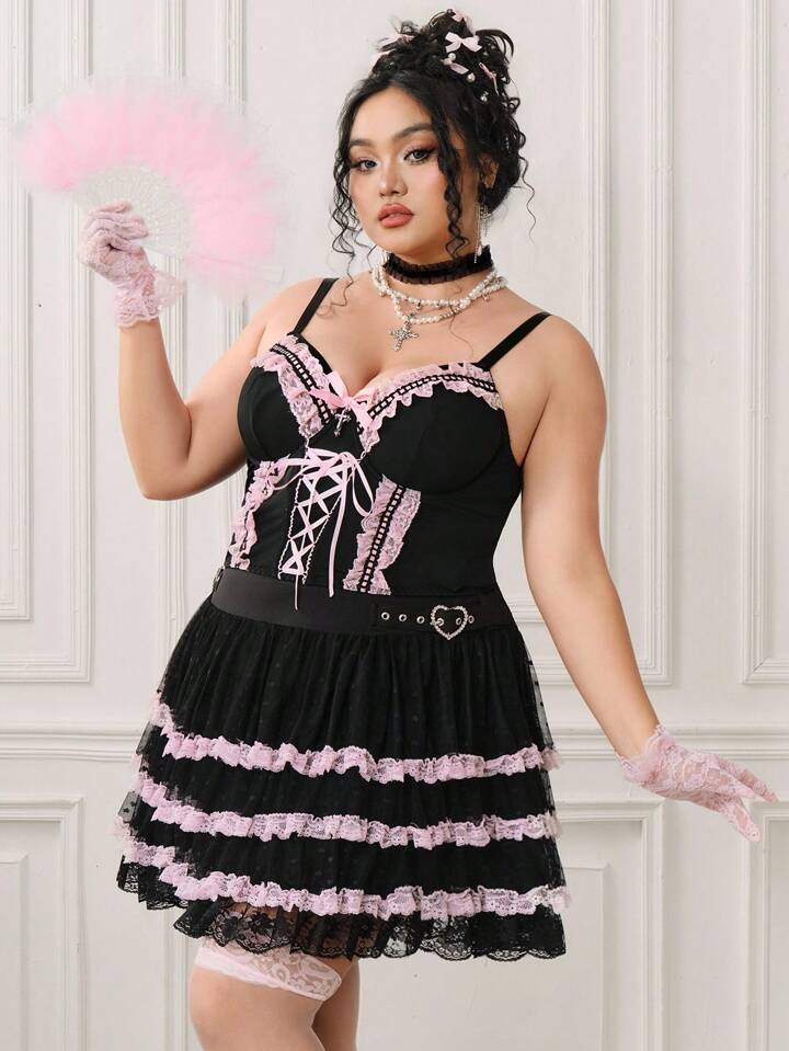 EDITION Plus Size Women Contrast Color Ruffle Lace Hem Mini Skirt