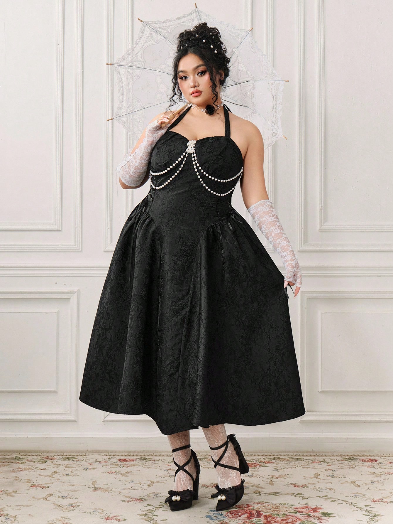 EDITION Plus Size Women Vintage Romantic Palace Jacquard Textured Fabric Pearl Chain Decor Ribbon Tie Waist Dress