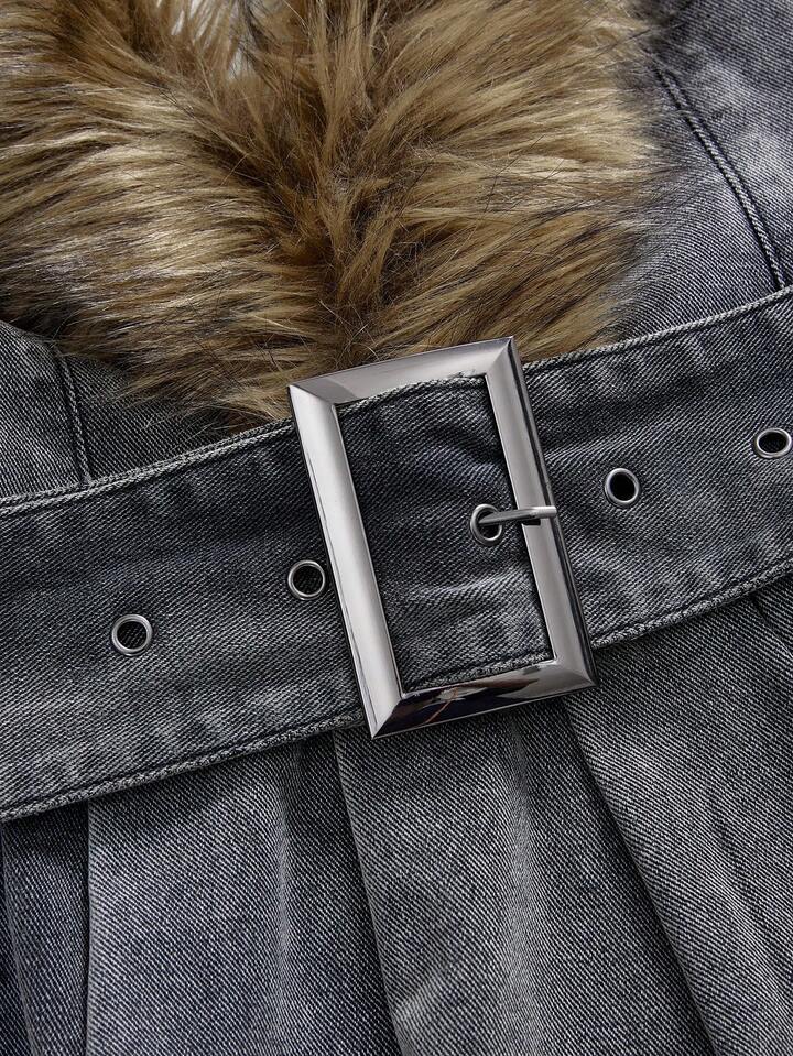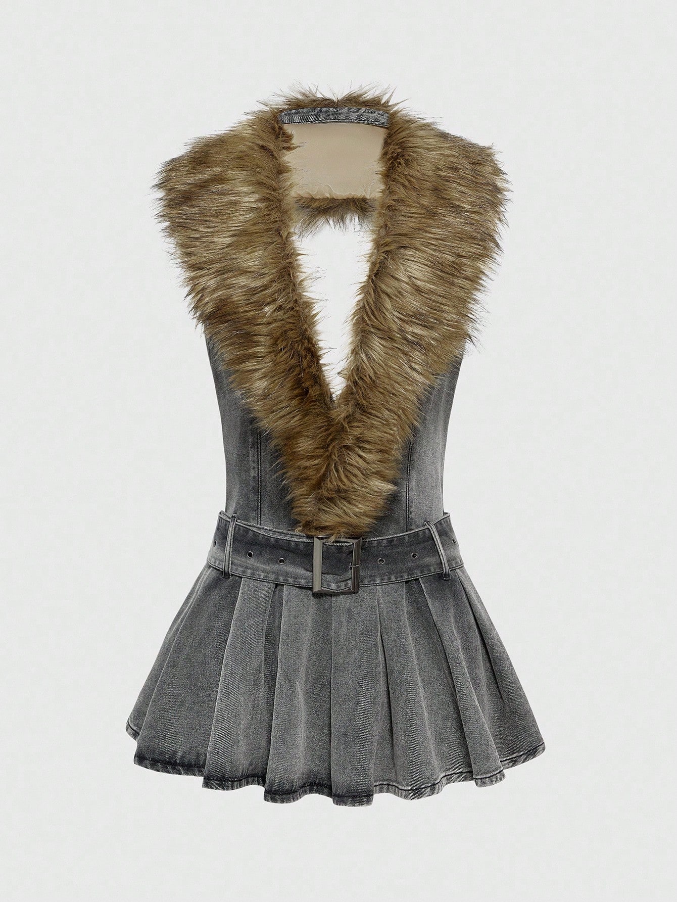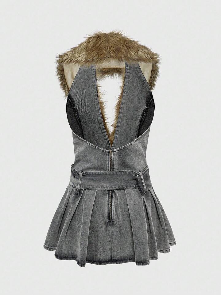 EDITION Women's Patchwork Furry Deep V-Neck Pleated Hem Sexy Halter Denim Dress