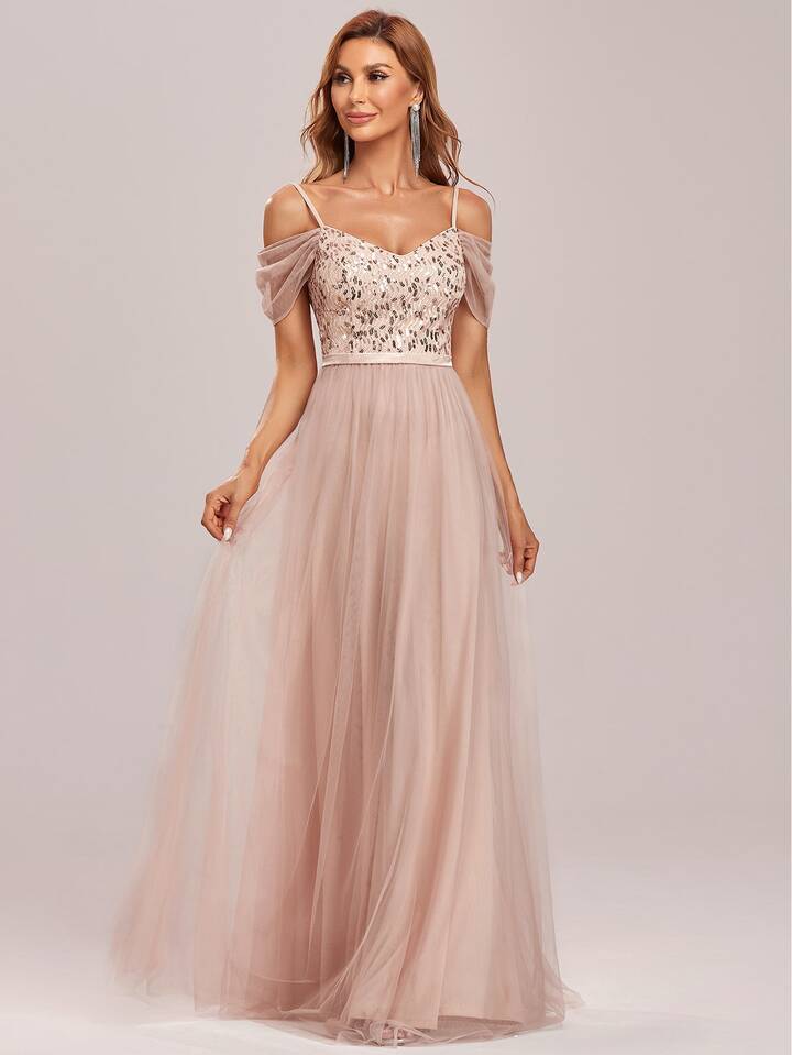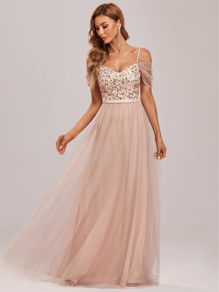 EVERPRETTY Contrast Sequin Cold Shoulder Backless Mesh Hem Prom Dress