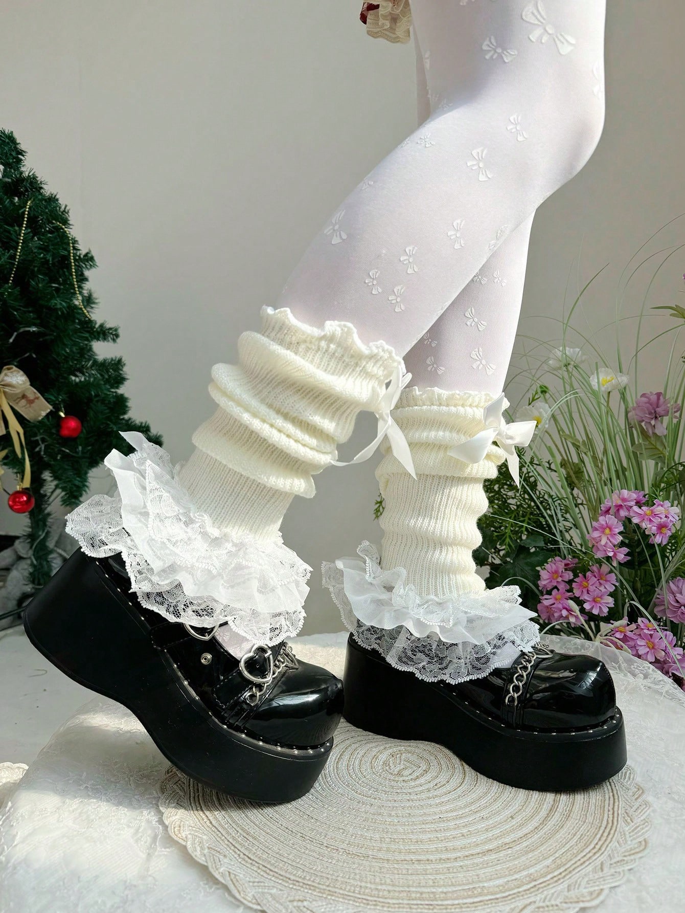 Fairycore 1 Pair Of Cute White Knitted Socks, Spring Multi-Layer Lace Stacking Socks, Lolita Style Fungus Edge Bow Leg Cover