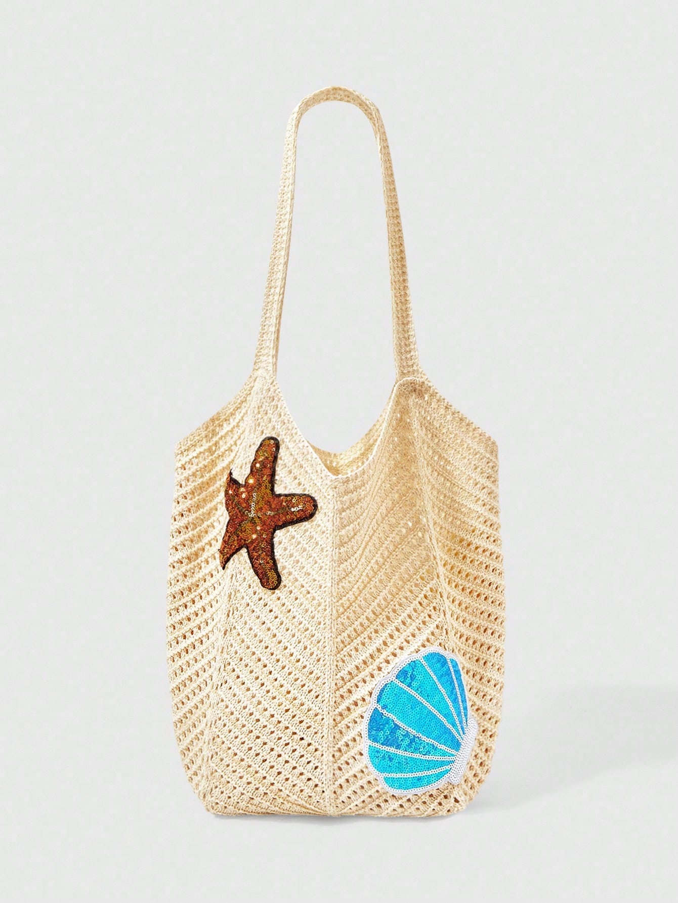 Fairycore 1 Set Beige Sequin Woven Beach Tote Bag, Fashionable Personalized Beach Resort Style Women Handbag