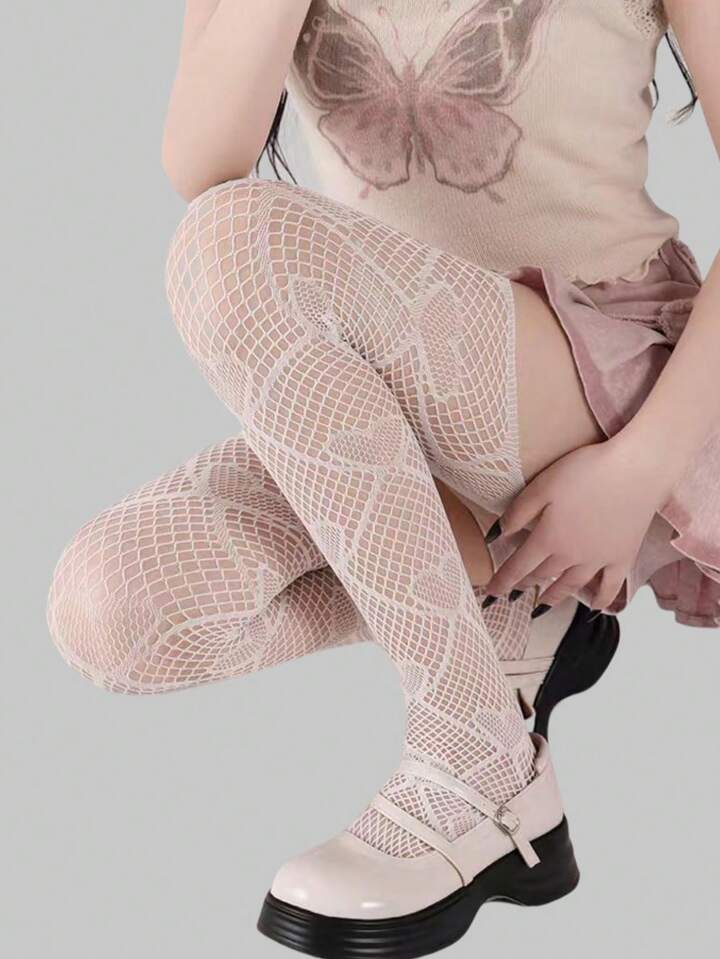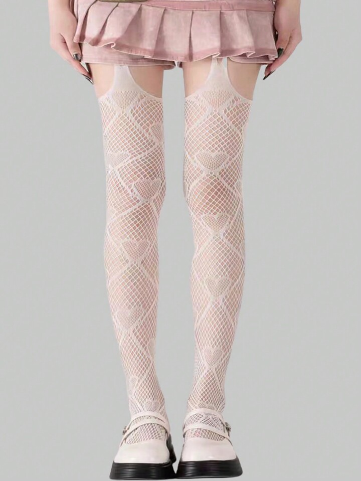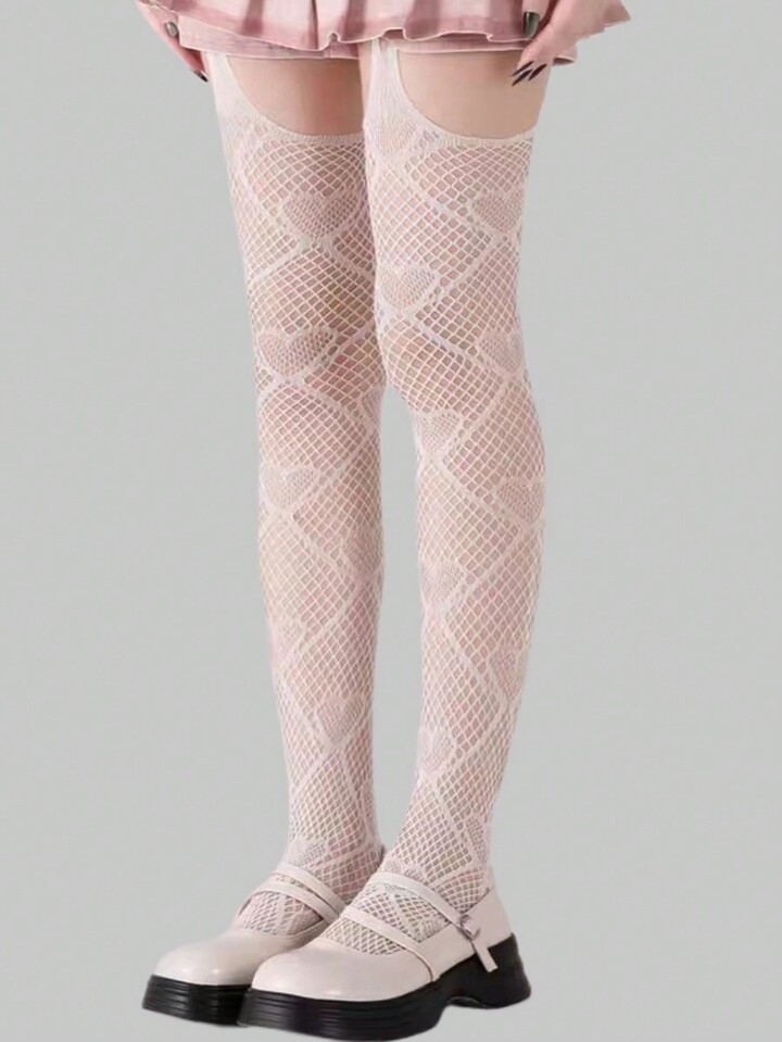 Fairycore 1pair Women's Diamond & Heart Pattern Thigh High Fishnet Stockings In White, All Seasons