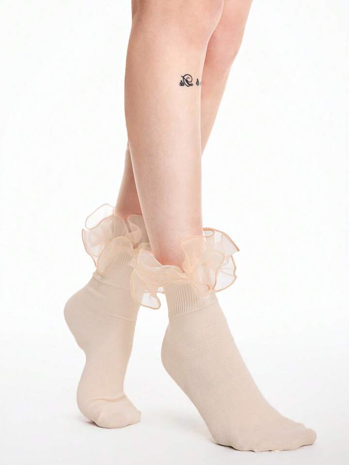 Fairycore 1pair Women's Ruffle Lace Trim Mid-Calf Dual Wear Socks, Light Orange Color, All Seasons
