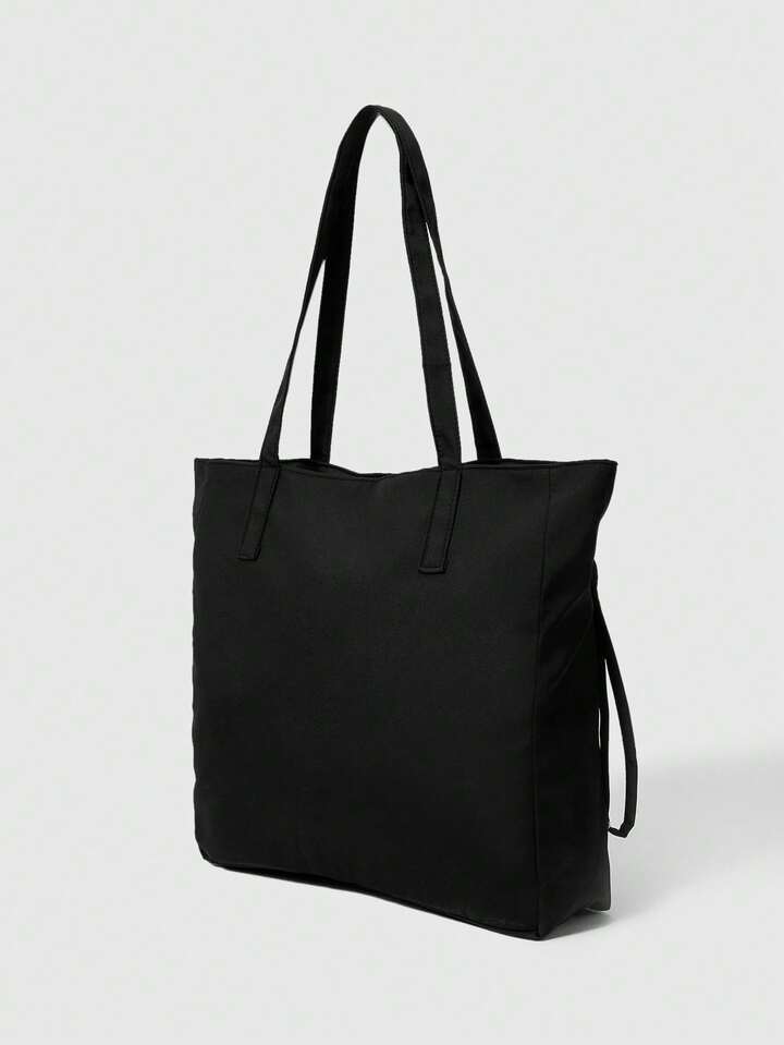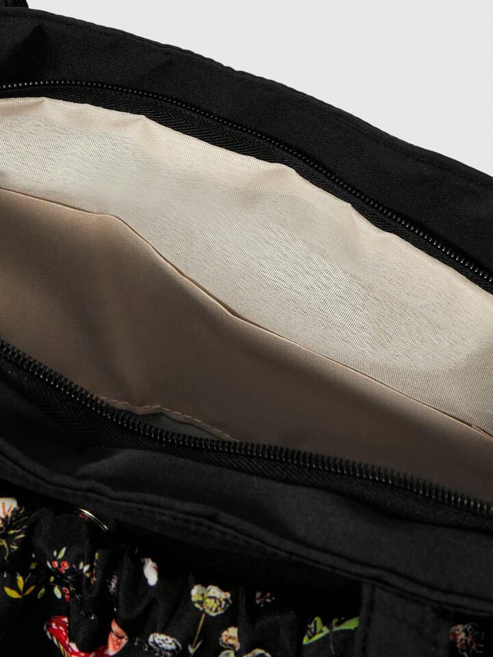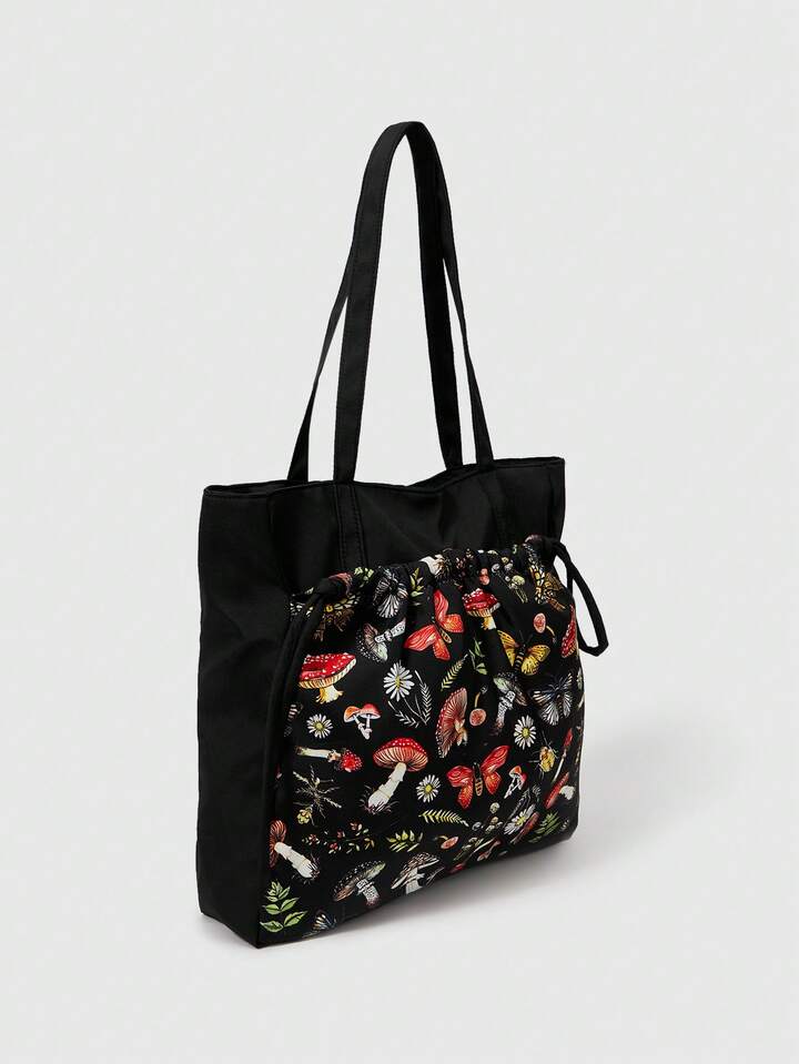 Fairycore 1pc Women Black Tote Bag With Butterfly, Flower, Plant And Mushroom Pattern, Suitable For Valentine's Day & Dating