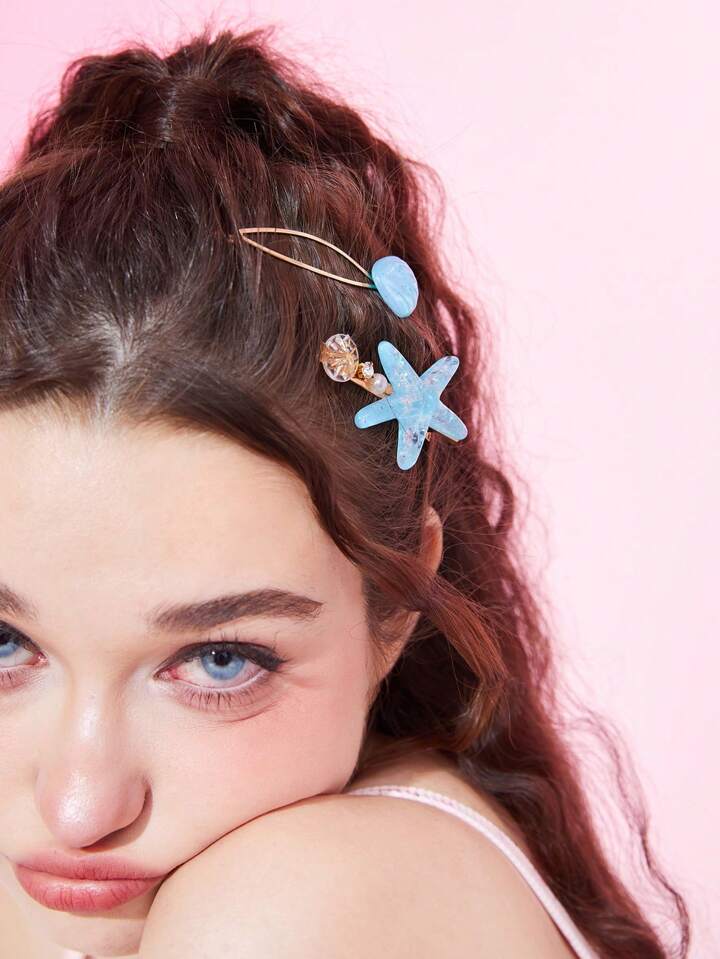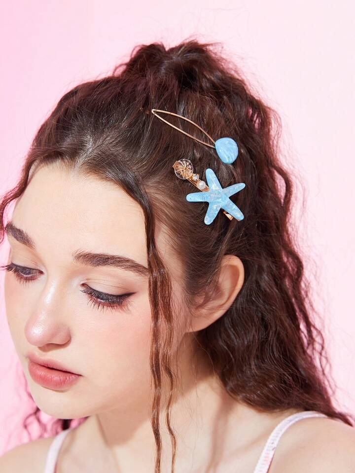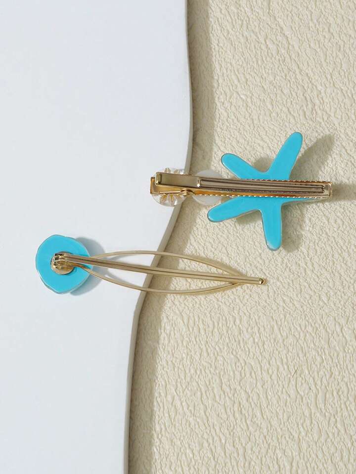 Fairycore 2pcs Women Starfish & Shell Decor Iron Alloy Hair Clip