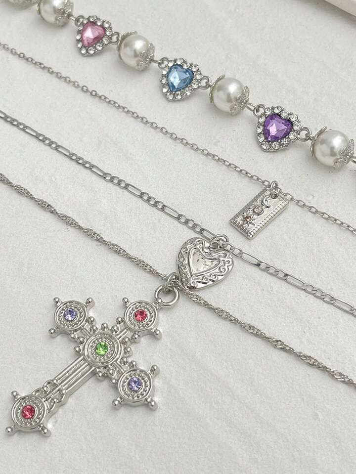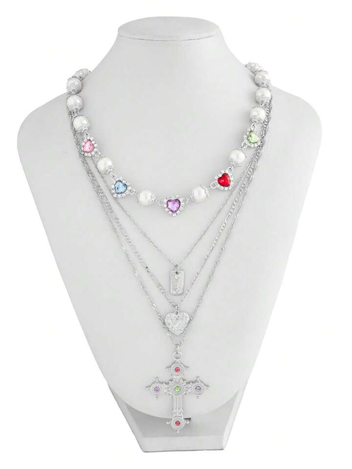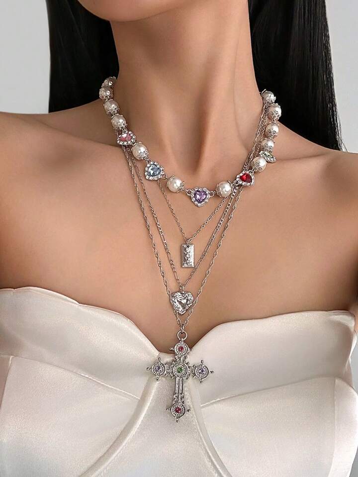Fairycore 4pcs Luxury Crossed Necklace Set With Faux Pearl And Crystal Hearts Decor, Stylish Jewelry