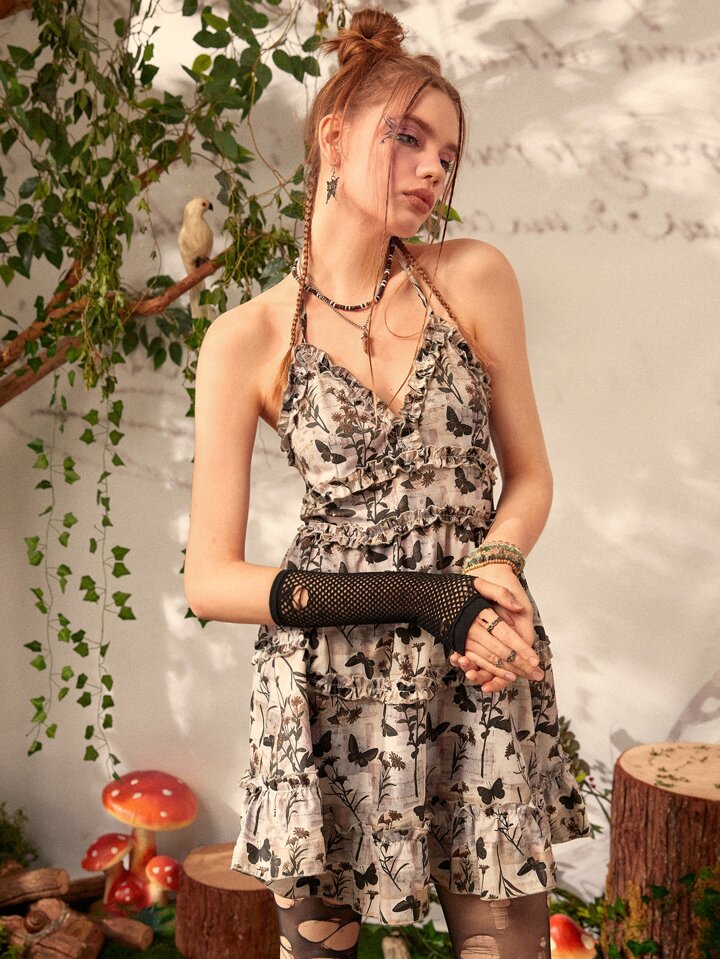 Fairycore Allover Butterfly Print Frill Trim Tie Backless Halter Dress