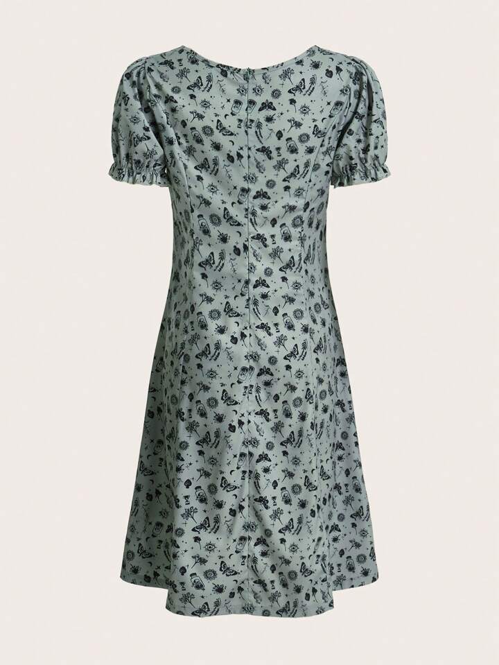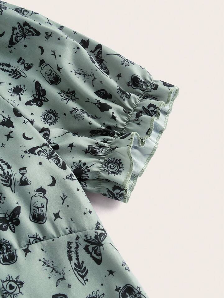 Fairycore Butterfly & Sun Print Tie Front Ruched Bust Dress