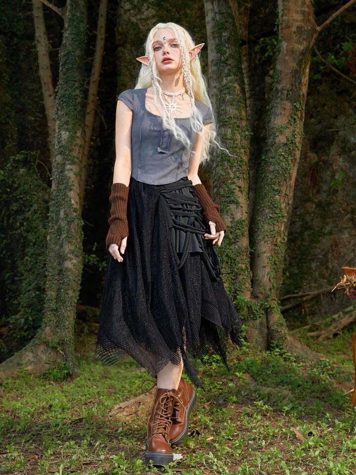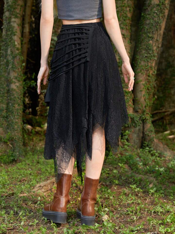 Fairycore Contrast Lace Ruched Asymmetrical Hem Skirt