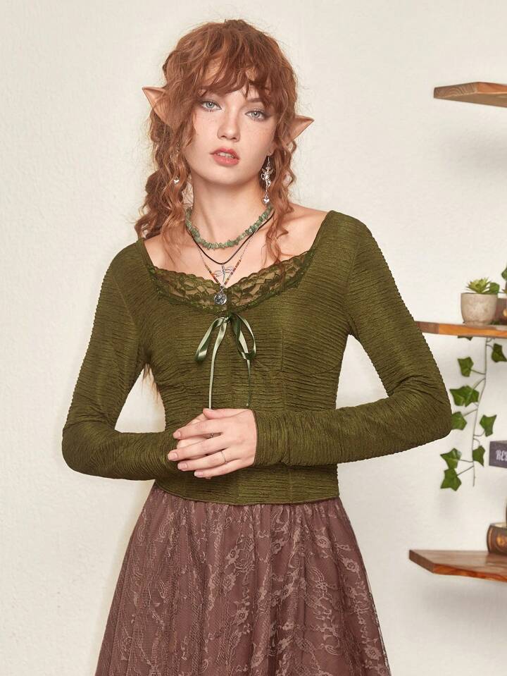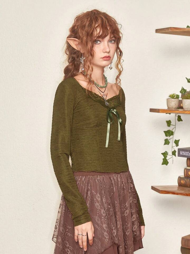 Fairycore Contrast Lace Tie Front Tee
