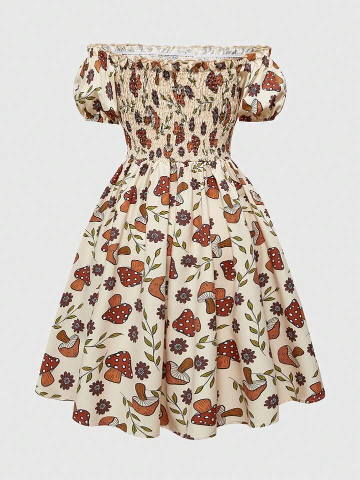Fairycore Countryside Style Plant & Mushroom All Over Print Off Shoulder Ruched Waist Plus Size Dress