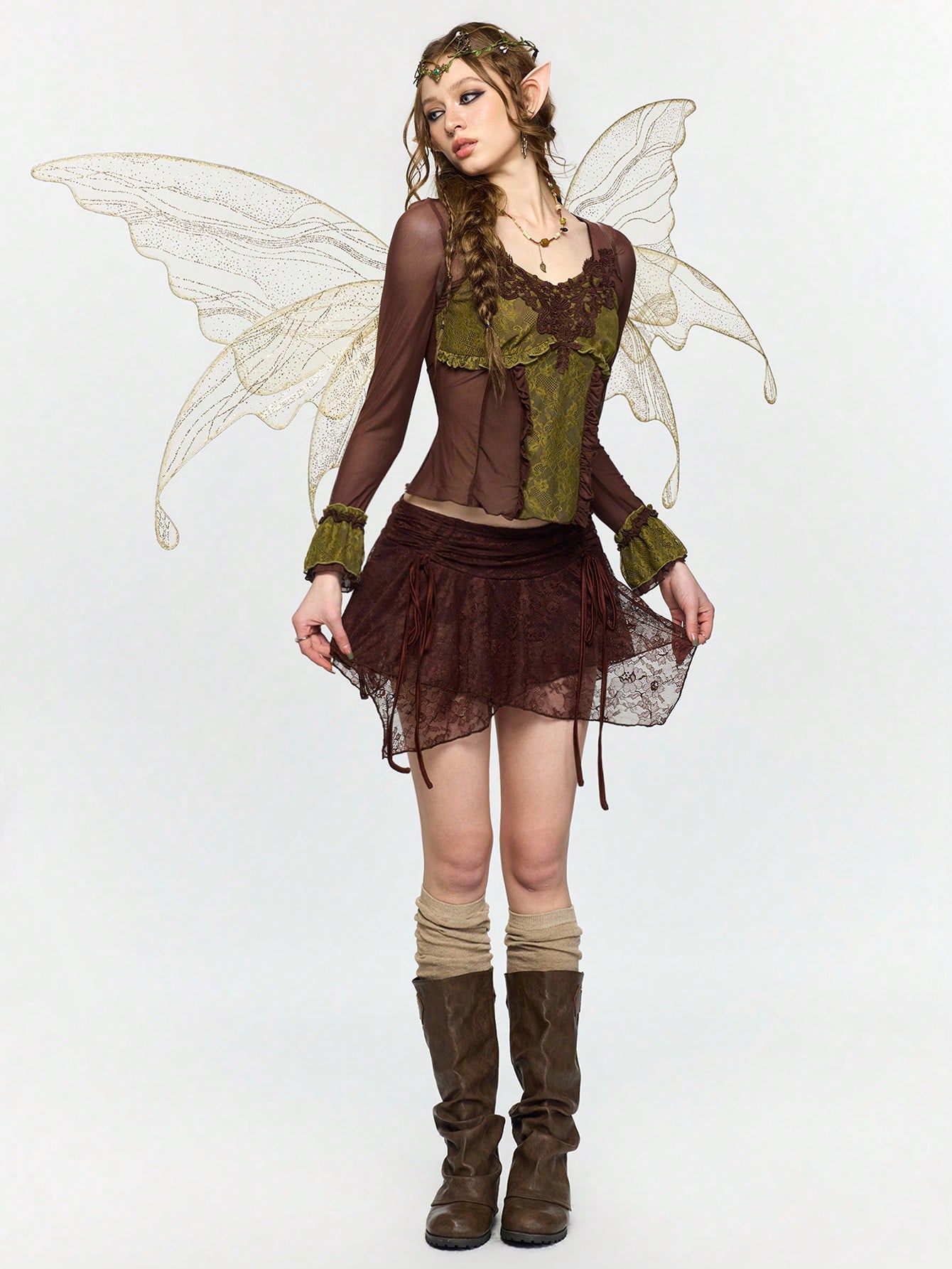 Fairycore Fairy Style Lace Patchwork Frill Trim Long Sleeve Fitted Women Top
