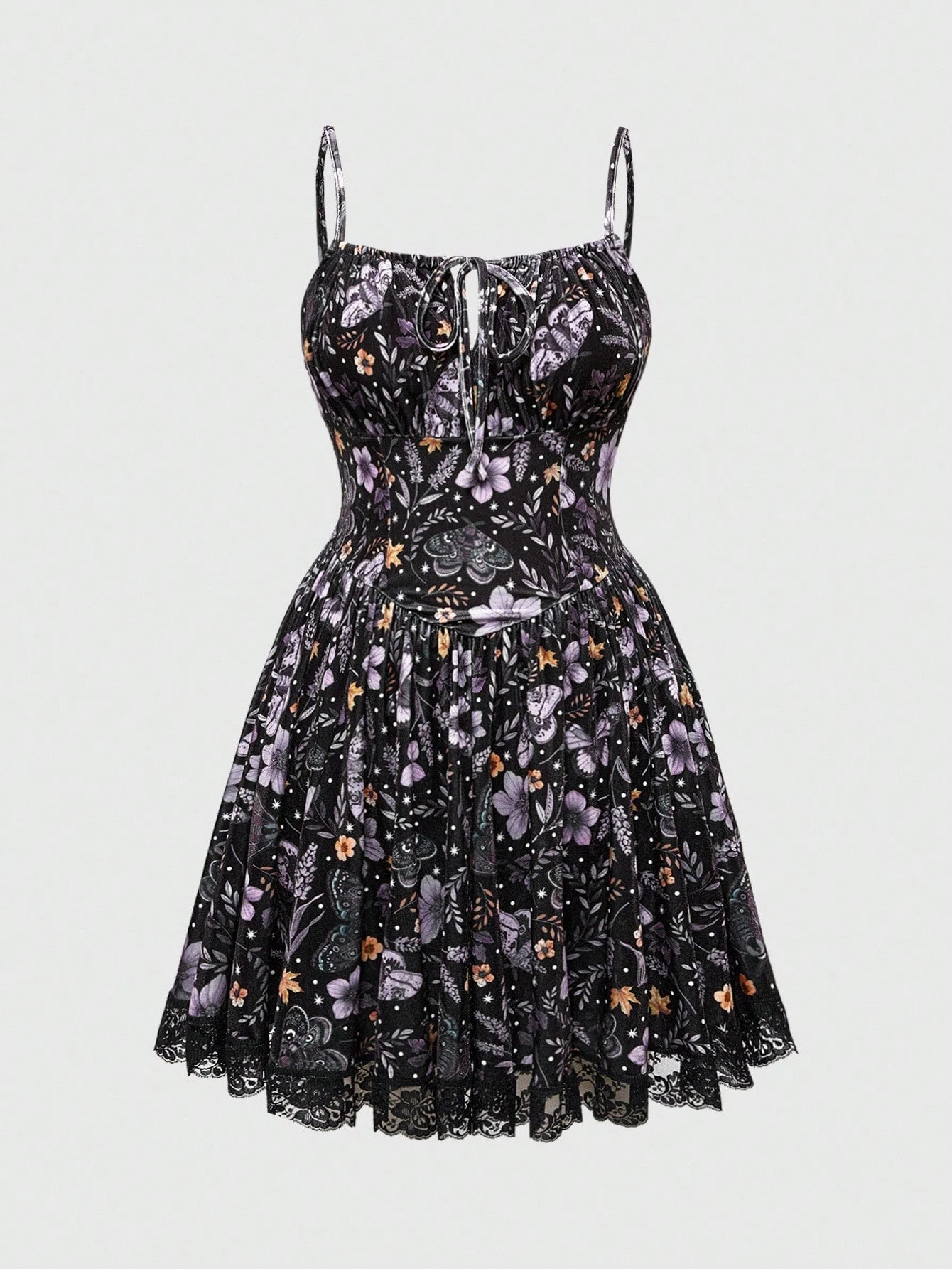 Fairycore Moth & Flower Print Lace Trim Velvet Plus Size Dress