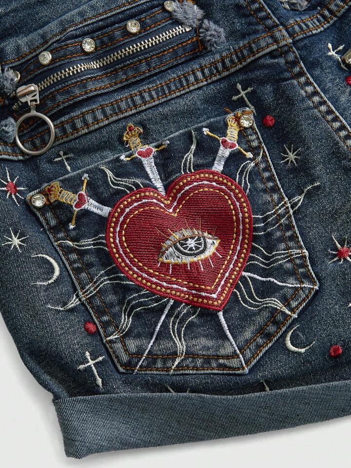 Fairycore Gothic & Retro-Style Heart, Eye & Star Embroidered Low Waist Denim Shorts
